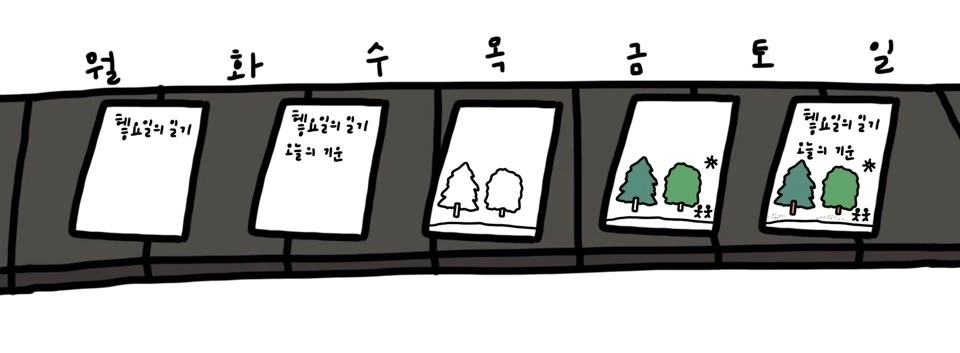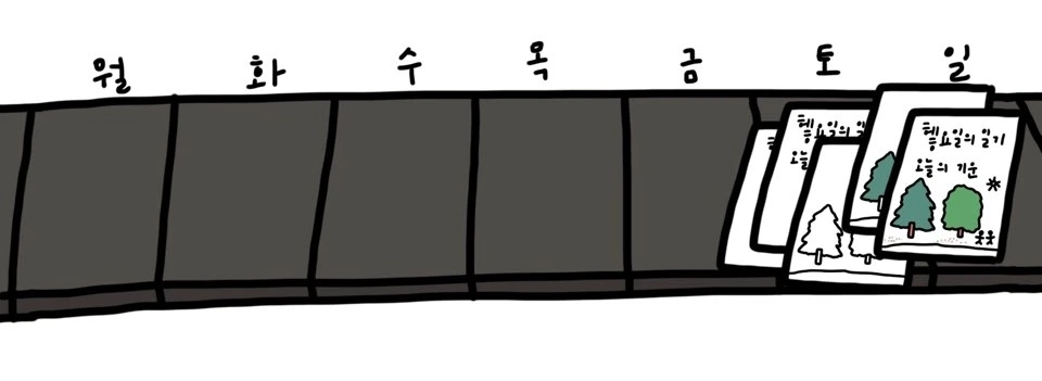 -> 아쉽게도 일기는 이제 일기장에 쓰려고 해요. 하지만! 헿요일은 계속될 거예요! 마침 글선미와 그림민기가 사부작사부작 얘기 나누고 있는 기획이 있답니다. 잠시 휴식 기간을 가진 후 새로운 형식과 주제로 찾아올게요. 꼬오오오오오옥 기다려주세요 ♡♥