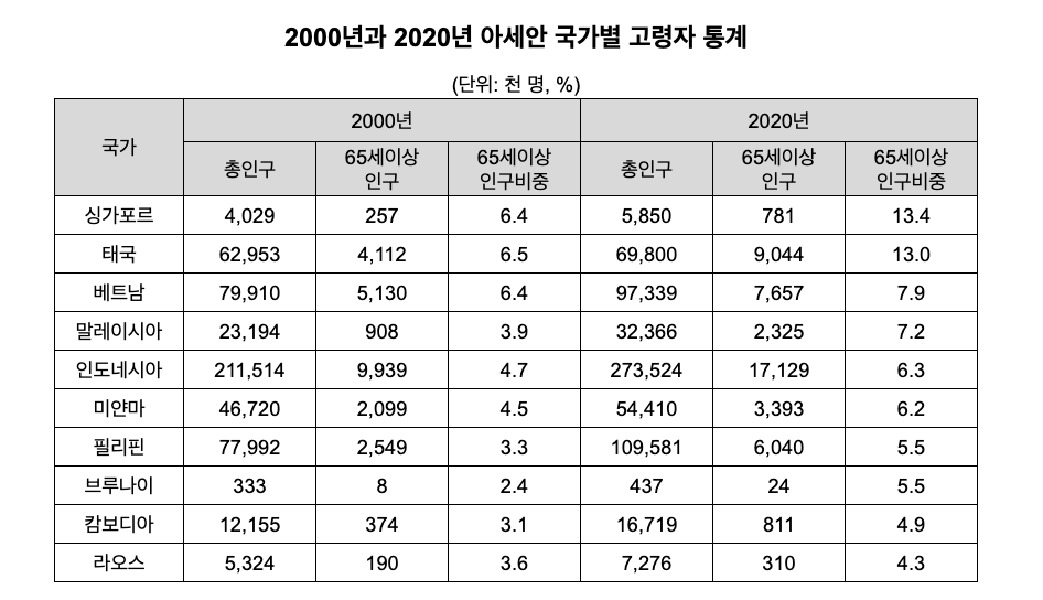 아세안 국가들이 괄목할만한 경제성장을 이루면서 선진국에서 나타나던 고령화 현상이 가속화되고 있다. 출산율은 지속해서 감소하는 반면, 경제 성장으로 인한 주거 환경 개전, 교육 수준 증대, 의료기술 발달로 평균수명은 증가하고 있다. UN 인구 전망 보고서는 지금과 같은 추이라면 싱가포르, 태국, 말레이시아, 베트남이 2020년 고령화 사회에 진입할 것으로 예측했다.