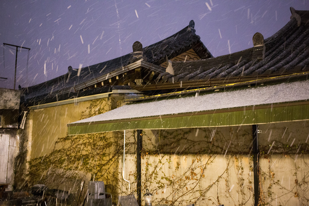 군산에서 전주로 넘어가 한옥 게스트하우스에서 잠을 자려고 하는데 어느 순간 사방이 고요하고 밖에서 싸악 싸악 하는 소리가 나는 것 같아 문을 열어보니 눈발이 날리고 있었다. 4월에 눈을 보다니. 신비한 여행이었다.