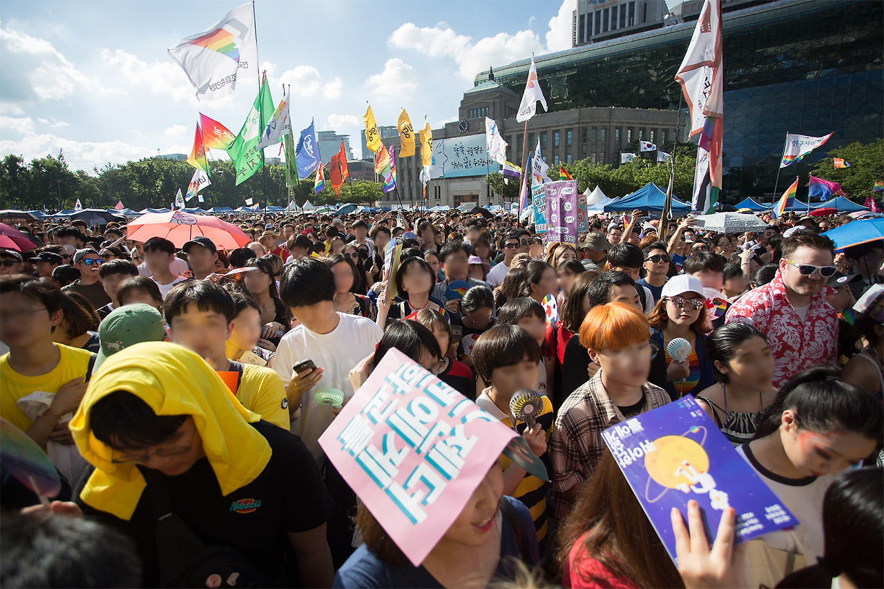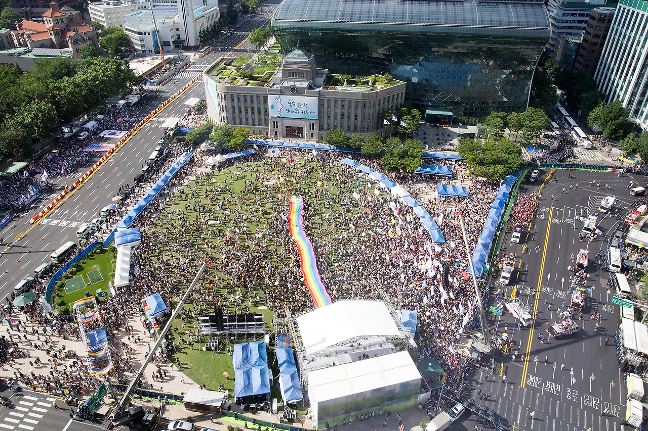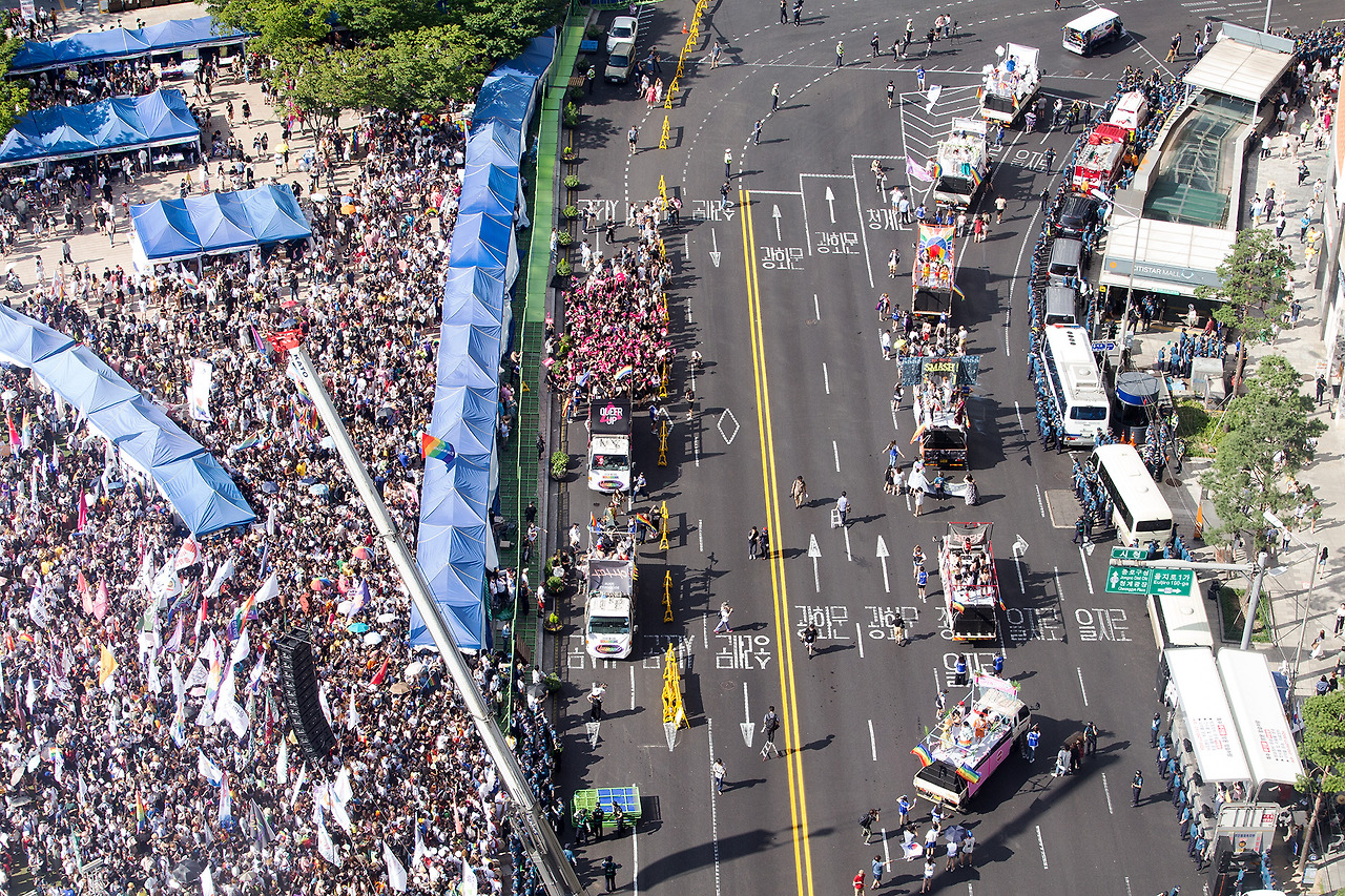 차량을 따라서 사람들도 신나게 걷고 있다. 이번 퀴퍼 행진 코스는 총 4km였다고 한다. 나는 퍼레이드 앞부분만 찍고 부스를 지키러 다시 서울광장으로 돌아왔는데 바이크 행렬이 출발한 지 1시간 30분이 지나도록 행렬 선두가 들어오지 않았다. 광장에 남아서 부스를 지키던 사람들은 모두 공포에 떨었다. '우리도 행진했으면 큰일 날 뻔했다. 더위 먹고 쓰러질 수도 있다.' 행진을 끝까지 완주하고 돌아오신 분들은 얼굴이 상기되어 있었다. 물론 힘들어서도 있겠지만 1년에 단 하루, 퀴어 티를 한껏 내면서 도심을 활보할 수 있는 날이 퀴어퍼레이드이기 때문이지 않을까? 1년 중 하루가 아니라 1년 중 365일 모두 내가 온전히 나일 수 있는 세상을 꿈꾸며 오늘도 퀴어 만세!