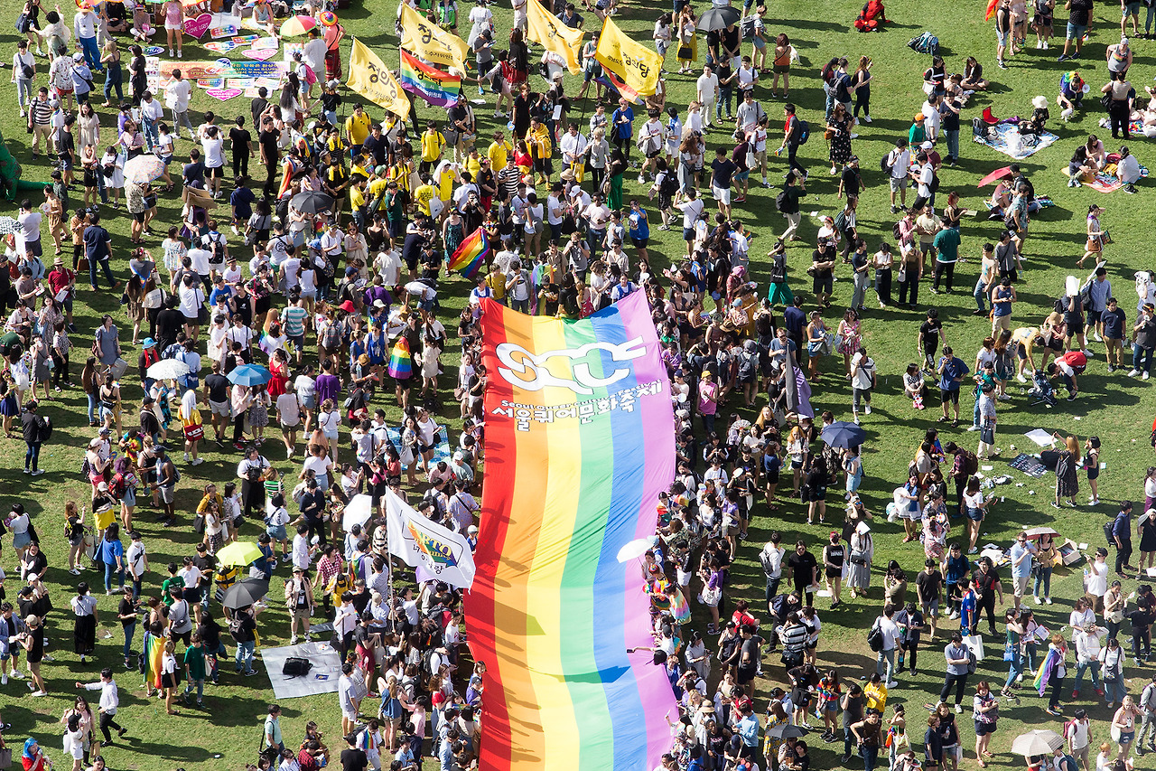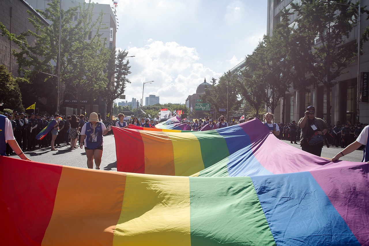 퍼레이드를 시작하기 직전 대형 깃발이 펼쳐졌다. 이번 퀴어문화축제를 위해 특별히 제작한 깃발 혹은 무지개 카펫인 것 같은데 위에서 내려다보니 더 아름다웠다.