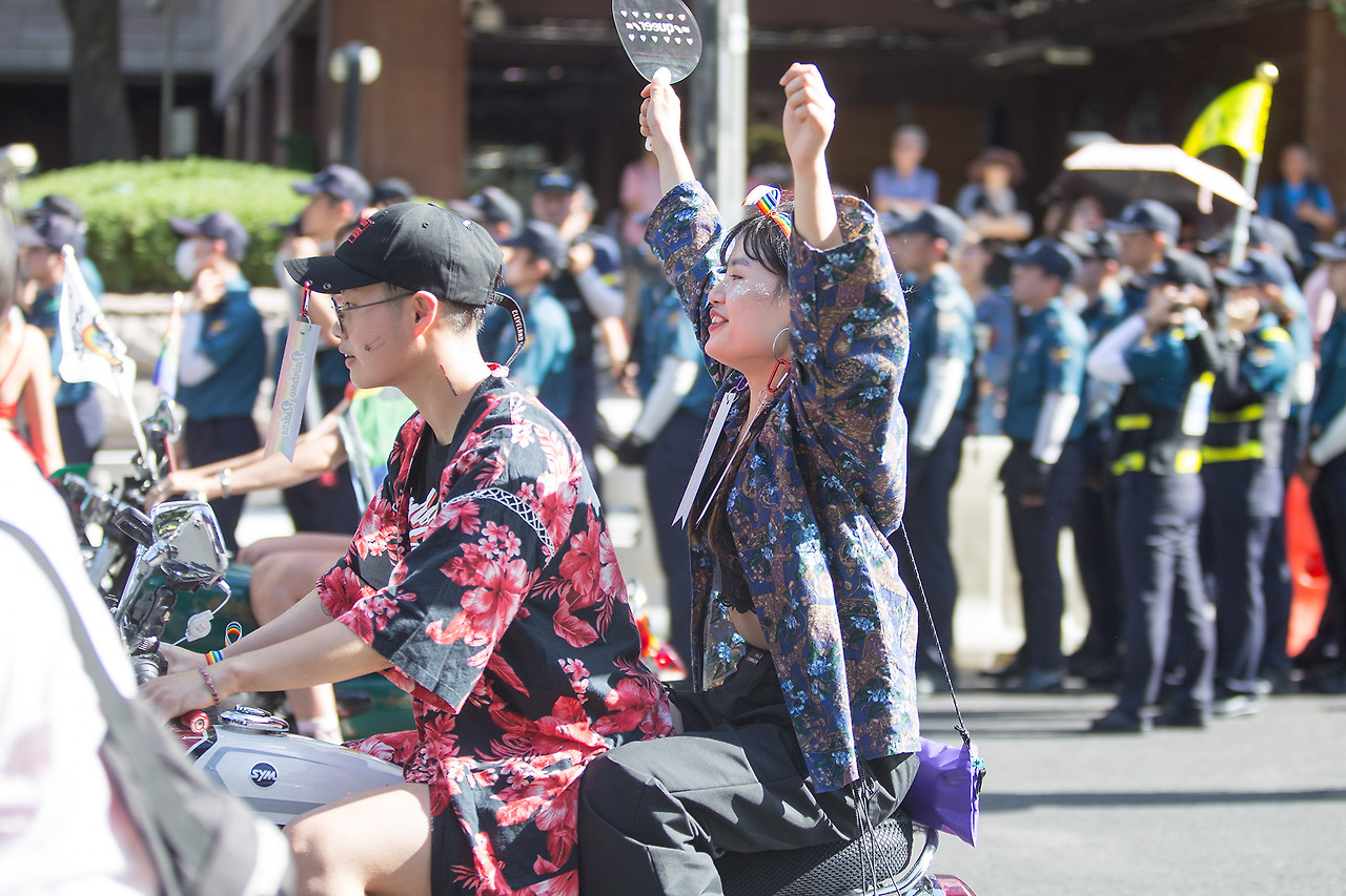그런데 대형 무지개 깃발이 펼쳐진 뒤에도 차량도 사람들도 출발할 기미가 없었다. 내가 있는 곳에서는 바이크 무리는 코빼기도 보이지 않았다. 알고 보니 바이크들은 차량들이 나아가는 방향인 을지로입구 쪽에서 자리를 잡아야 하는데 혐오 세력들이 아스팔트에 드러누워서 바이크 행진을 방해했다고 한다. 그들은 경찰들에 의해 수 분만에 끌려나갔고, 난 그들이 퍼레이드를 지연시켜준 덕분에 부리나케 달려가 바이크들의 앞까지 갈 수 있었다.