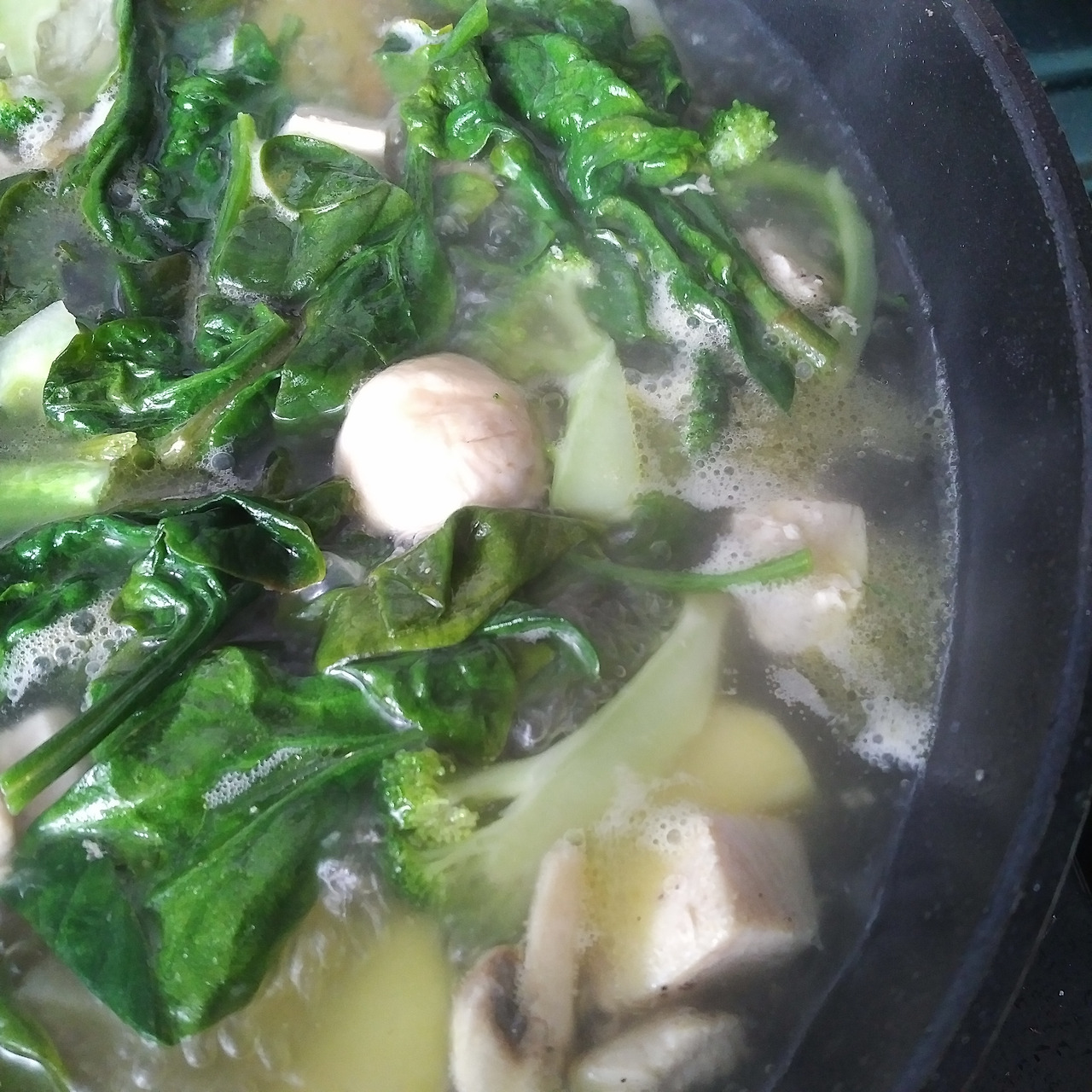 2. 채소가 꽉 잠길 정도로 팬에 물을 콸콸 붓는다. 가스레인지에 불을 올리고 채소들이 보글보글 끓기를 기다린다. 처음엔 센 불로 시작했다가 채소들이 끓기 시작하면 중불로 내려준다.