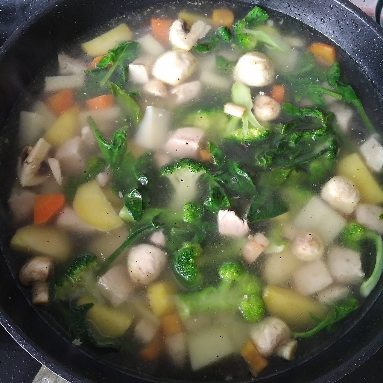 1. 우선 카레에 넣고싶은 채소(냉장고에 짱박혀 유통기한이 오늘내일하는 채소)들을 깍둑썰기해 팬에 넣고 올리브유에 볶는다. 나는 냉동실에 남아있던 닭가슴살도 함께 볶았다. 볶아주는 이유는 채소 표면을 기름으로 코팅해야 나중에 물로 팔팔 끓인 뒤에도 채소들이 부서지지 않기 때문이다. 채소를 적당히 볶았으면 소금후추간을 하고 조금 더 볶아준다