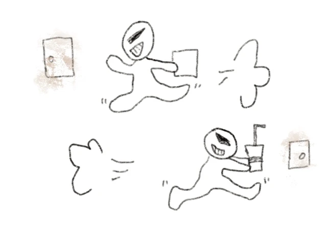 똑딱님들이 갖고 있는 펜들이 각각 다르고 누르는 리듬도 달라 볼펜 오케스트라도 할 수 있지 않을까? 란 생각을 잠깐 했습니다. 가끔 심각한 상황도 오는데 이리저리님들과 똑딱님들이 서로 만납니다. 둘의 시너지 효과가 엄청나네요. 이리저리님들이 똑딱님들을 데리고 독서실 밖으로 나갑니다. 나가는 도중에도 똑딱똑딱 거리며 문을 쾅 닫으며 여기저기 움직이네요. 총체적 난국입니다.