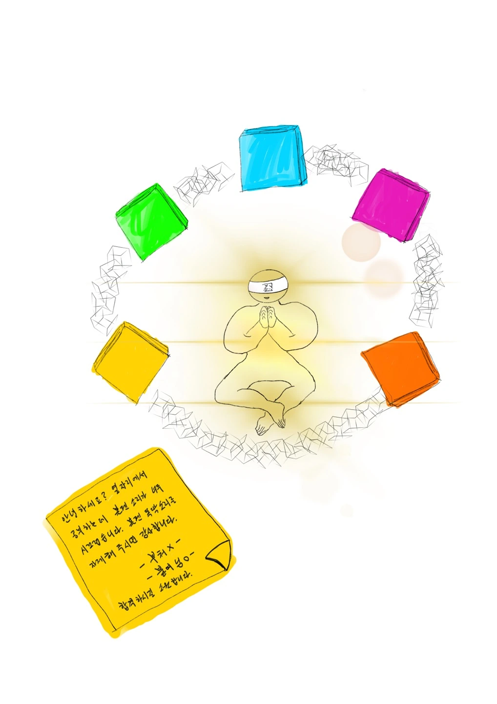 누군가에겐 기침보다 볼펜의 똑딱거리는 소리가 더욱 거슬렸던 모양입니다. 하지만 이전까지 만난 존재들과는 다르게 실체가 없었습니다. 부처 아닌 붙여님은 과연 누구였을까요? 어디에도 존재하며 존재하지 않았습니다.