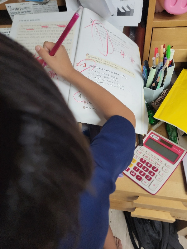 푸는 의미가 없어서 찬찬히 설명 해주고 있는데 아들이 어쨋든 맞추었다며, 엄청 큰 동그라미 표를 그리다가 찌그러진 모양이 되었어요.