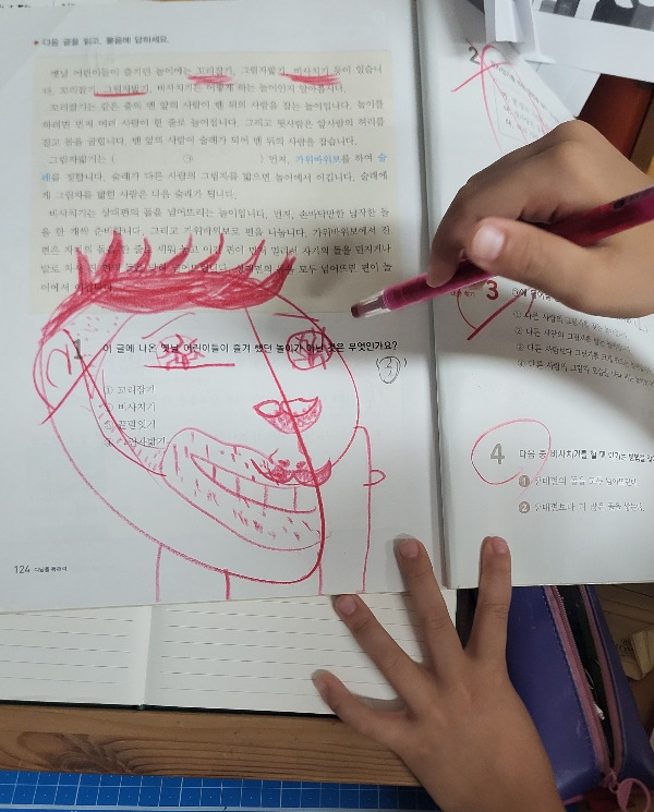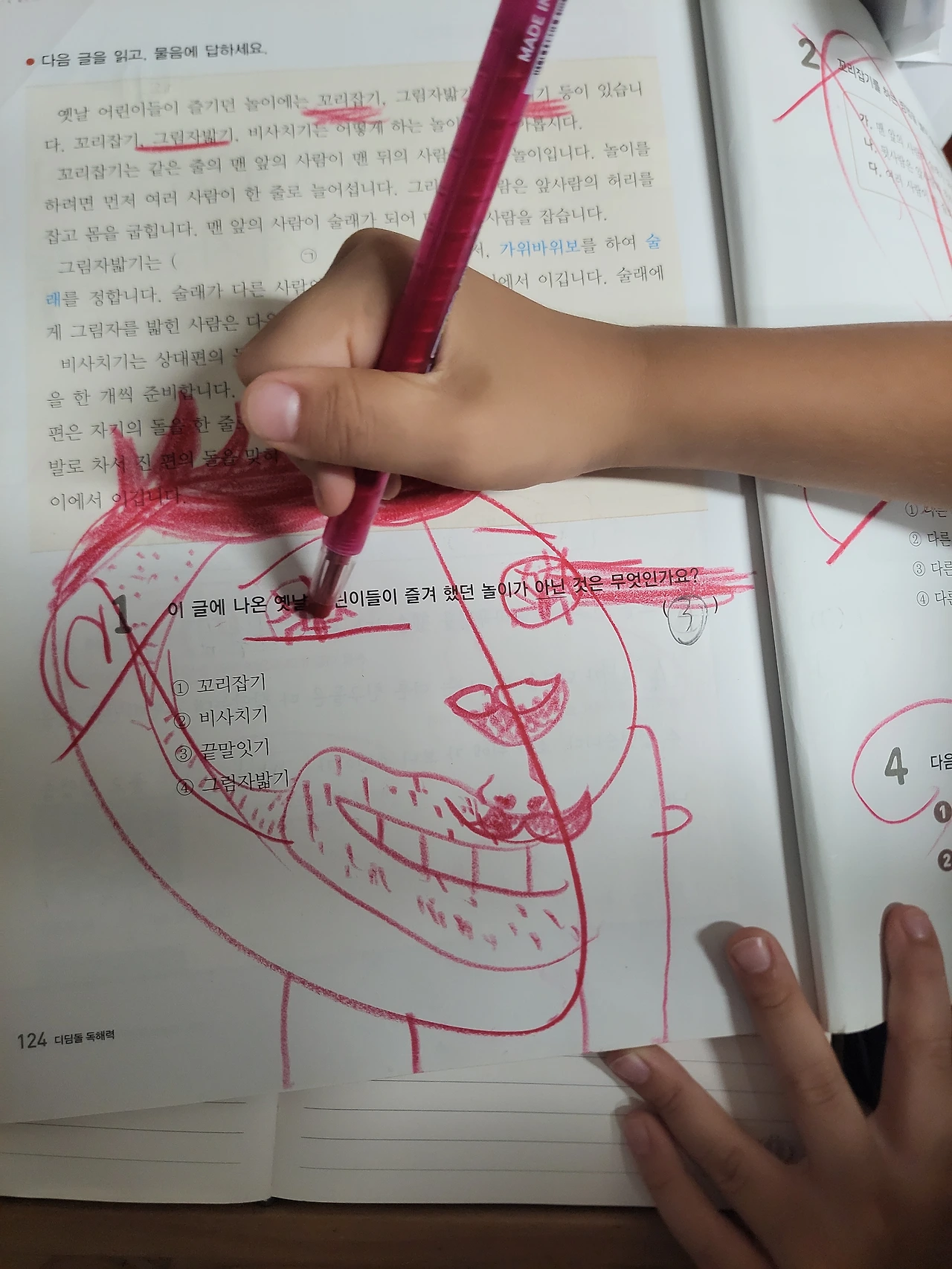 《디딤돌 독해력 초등국어 1》 하루 5문제 푸는데 어서 해치우고 놀고싶은 나머지 4문제를 틀려주는 아들. 다시풀게 하니 또 틀리고, 스무고개 하듯이 아닌답만 피해서 1번 문제를 세번 풀게 했더니 결국 남은 답을 찍어 맞추었어요.