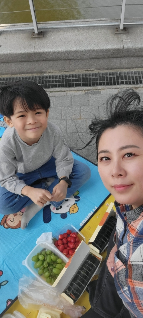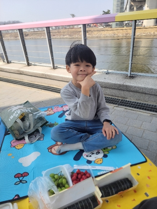 여러 기능을 이용한 폰 사진 찍기를 좋아하는 아들이에요. 간단한 과일과 얌샘김밥, 돗자리라 하더라도 자전거 바구니에 실으니 가득이었어요.