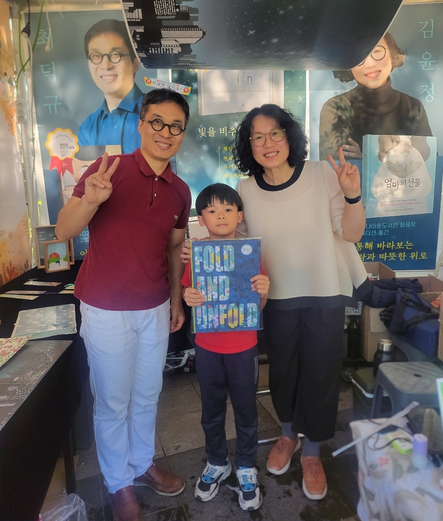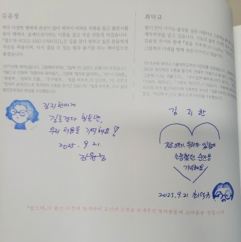 저는 동행한 아들의 이름을 넣어 공동집필 작가님들의 사인을 각각 받았지만, 저를 위한 그림책이기도 했습니다. 무언가를 새로 시작하는 마음을 잡고 싶을 때 <접으면> 그림책은 너무너무 좋은 책이었어요.