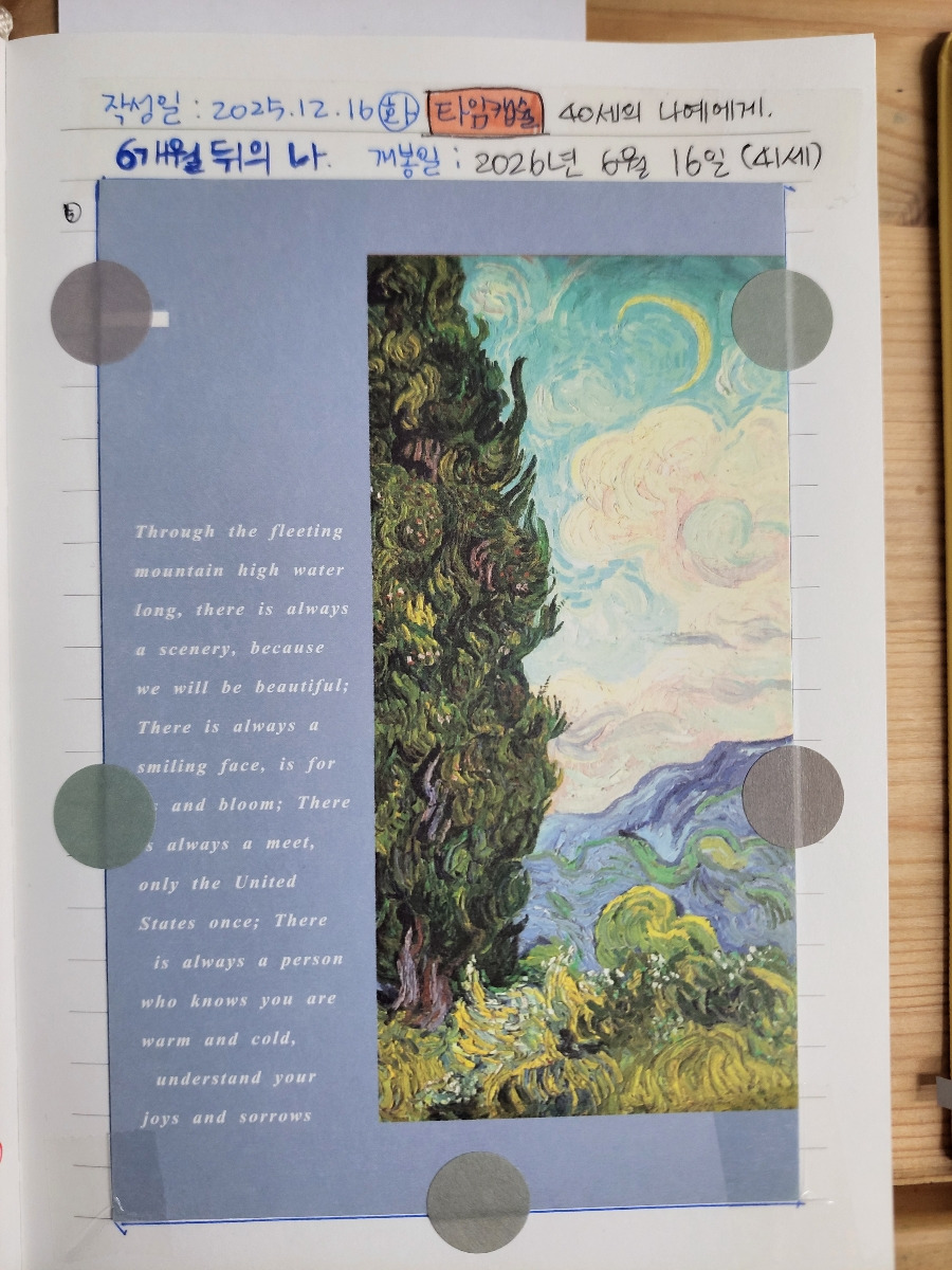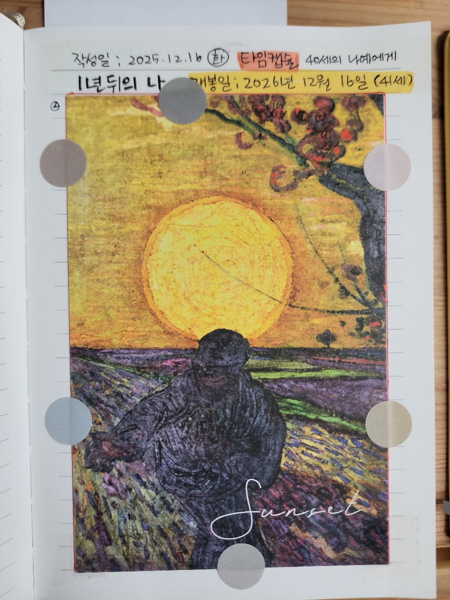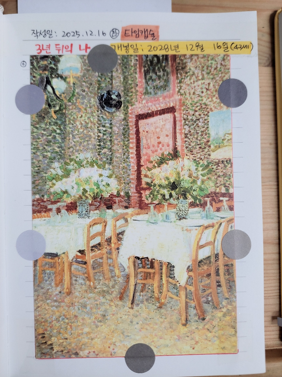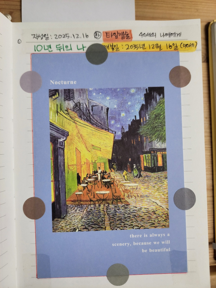 방식은 10년 후의 내가 2025년 12월의 나에게 보내는 편지와 자기 자랑 형태로 노트에 쓰고 엽서로 봉했다. 그다음은 5년 후의 내가 현재의 나에게, 3년, 1년, 6개월 순이다.