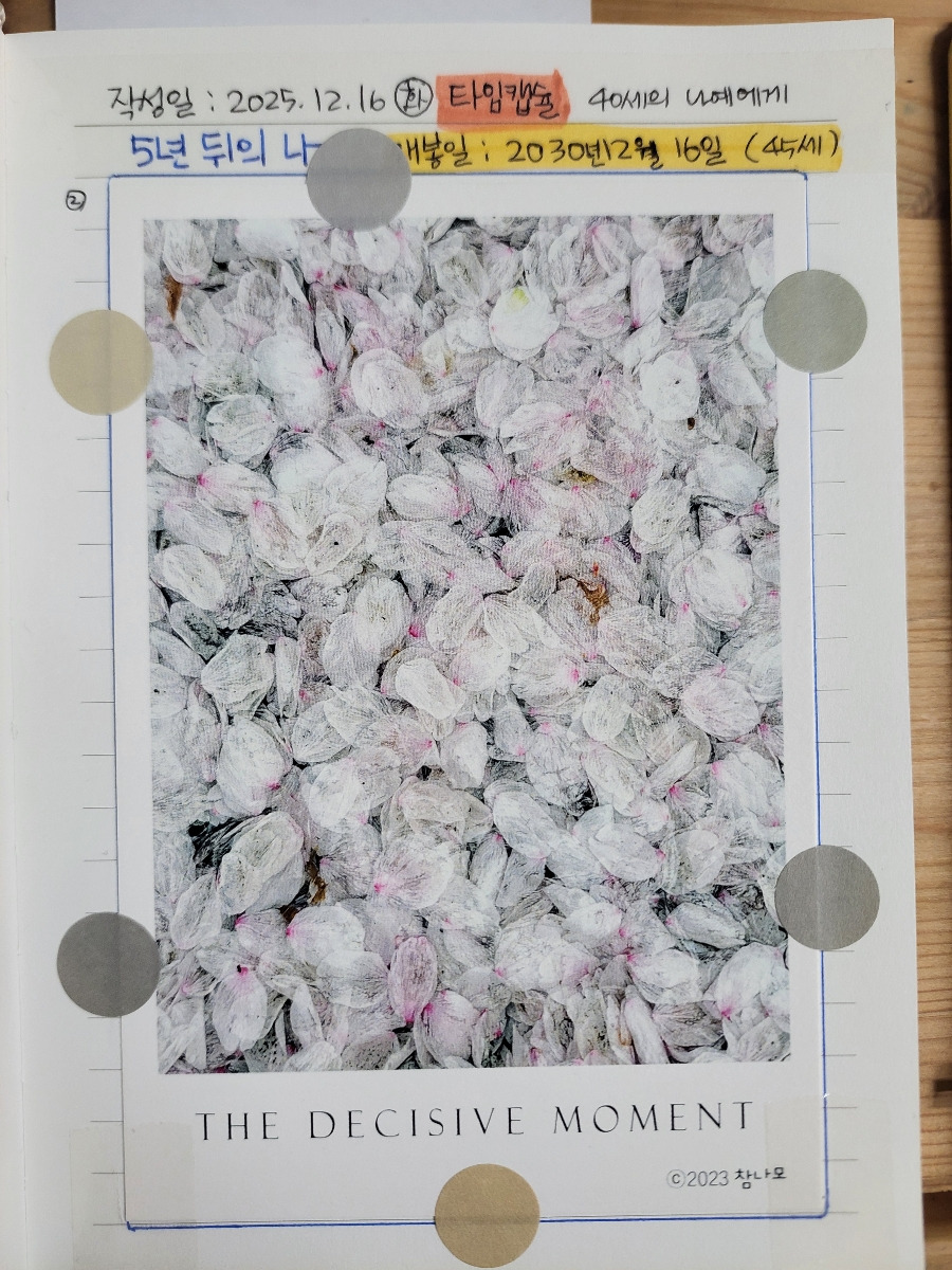 미래의 이상향을 담은 나의 모습을 타임캡슐이라 여기고 아카이빙노트에 썼다. 원래 가까운 미래부터 먼 미래로 쓰려하다가 생각을 바꾸었다. 최종 도착지 없는 노력은 방향이 조금 틀어진 비행기처럼 엉뚱한 곳에 착륙할 테니까.