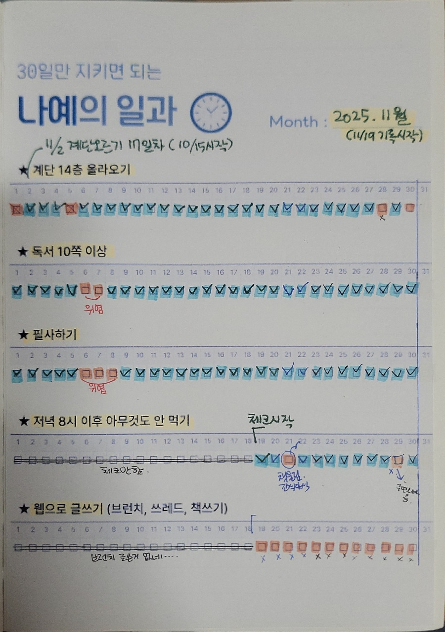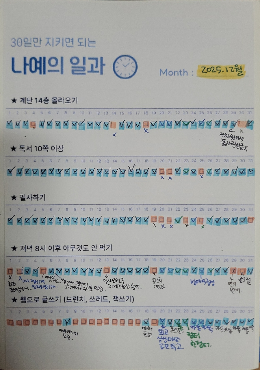 매일 아무 곳에라도 주제에 대한 글 1줄 쓰기, 매일 계단으로 집에 가기. 이거 조차 안 하면 오늘 공친 거다, 하는 마음으로.