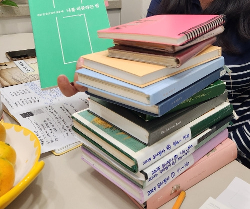 신기하게도 그런 미션이 없으니 독서량이 줄어들었다. 한동안은 홀가분한 마음으로 여가시간을 보냈고, 어느 날 문득 내가 독서를 거의 하지 않은 지 반년이 지났다는 걸 깨달았고, 다시 시작하는 독서는 노트에 필사를 곁들이며 하게 되었다. 오래 쓰면 손이 아파지니 힘 안 들이고 쓰는 만년필로 바꿨다. 쓰는 양이 2배로 늘었다. 특히 도서관에서 빌린 책은 나에게 와닿은 문장을 더 열심히 베껴 쓰게 되었다. 그러다가 '이 좋은 거'를 같이 하면서 집 가까운 곳에 책 친구를 만들면 좋을 것 같아서 아파트 독서 필사모임을 만들었다. 고인 물 멤버들과 필사 사진을 공유하다 보니 어느덧 세 달 뒤면 개설 3주년이다.
