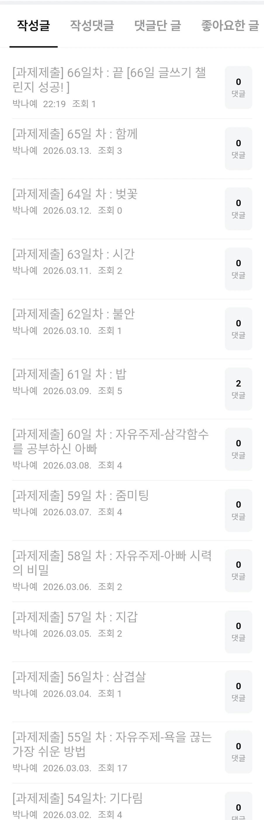 어제 '함께'라는 제시어로 조금 이른 축배일수 있었지만, 챌린지 마무리 글을 썼다. 설레발 치다 오늘 못쓰면 안 되는데, 하며 종일 신경이 쓰였다. 그럼에도 불구하고 빨리 써 해치우지 않고, 마지막 제시어인 '끝'에 대해 길게 생각해 본 날이었다. 66일은커녕 매일 나의 글쓰기를 10일 이상 해본 적도 없었다. 66일 목표지점을 통과하며 나의 가능성을 인식했다. 훗날 내 실력이 향상되어 66일 동안 쓴 글들이 모조리 부끄럽고 조잡해 보여 오글거리겠지만 일단 지금은 내가 자랑스럽다.