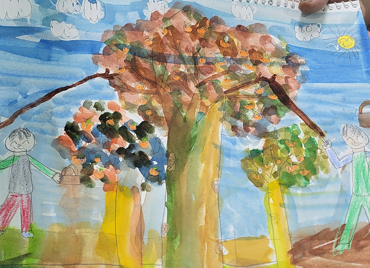 정말 엄청 긴 장대 끝을 반 갈라 다듬어서 그 틈새에 감나무 잔가지를 끼워 넣고 뚝. 하고 꺾으면 마른나무 끝에서 단감도 대봉시도 아닌 일반 감이 수확되었다. 말로만 듣던 까치밥도 2개나 남겨 두셨다.