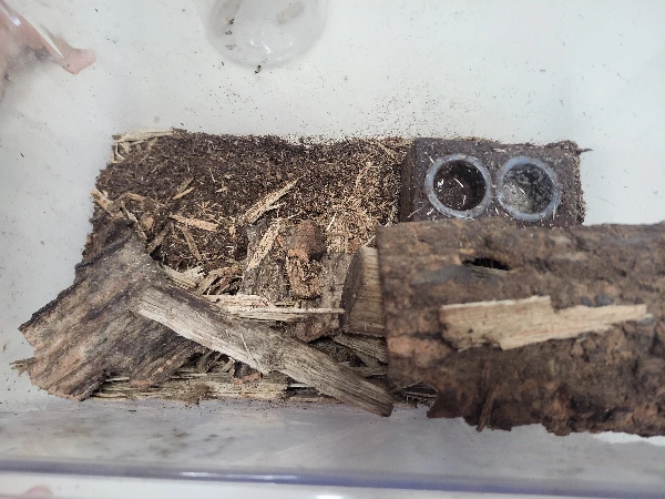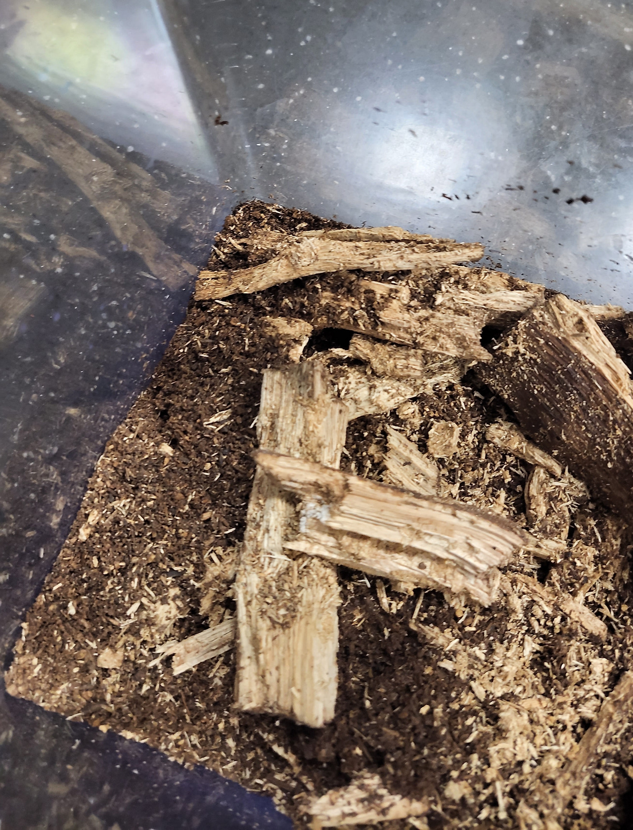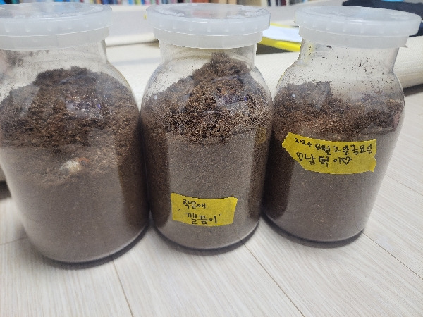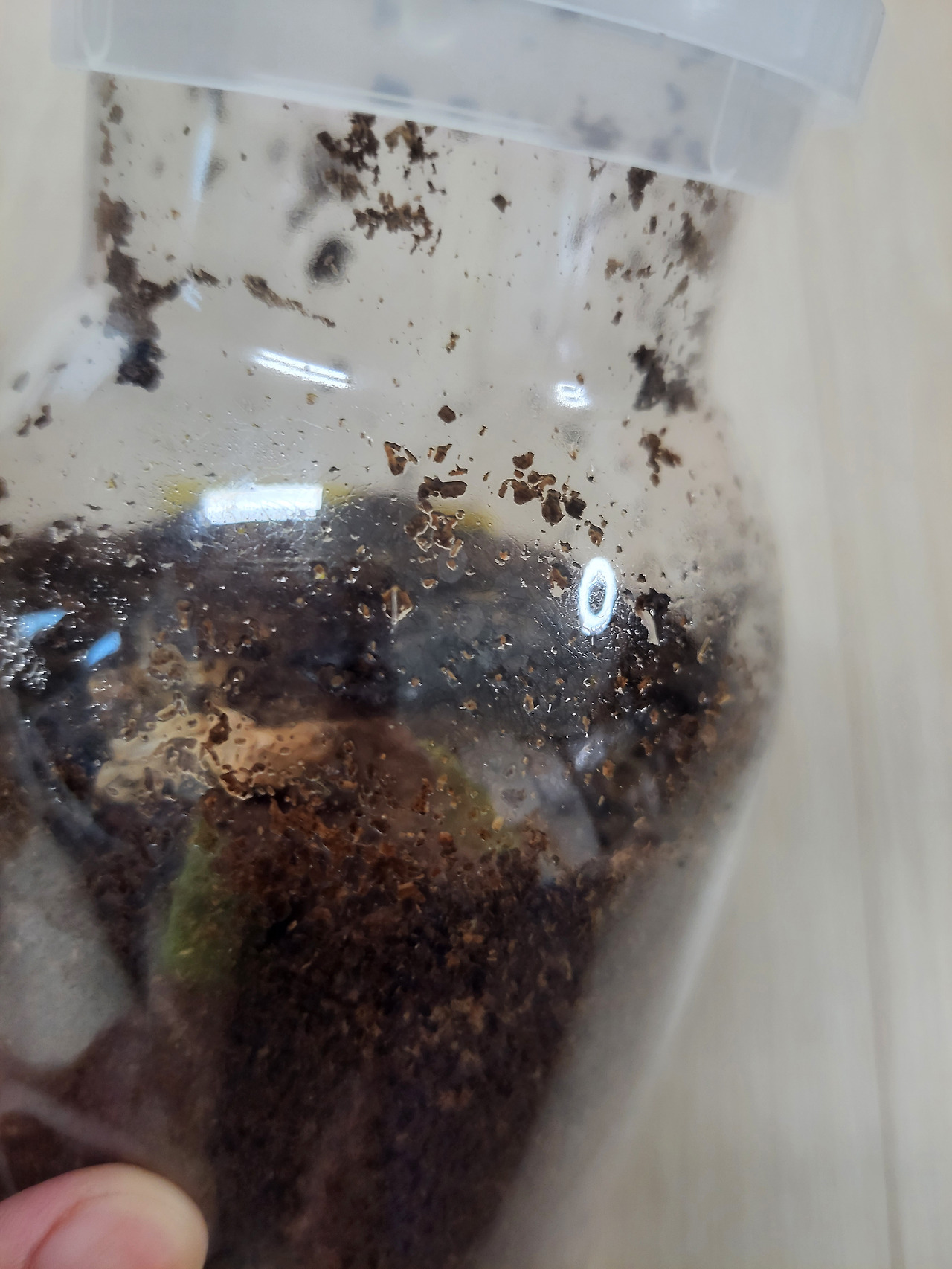 첫 달에 채집통 속 여기저기를 기어 다니는 불그스레하고 미세한 진드기가 발효톱밥에 섞여 들어왔었는지 어쩌다 생겼는지 방충시트를 덮었지만 자꾸 생겨서 바닥재 톱밥을 갈아주었습니다.