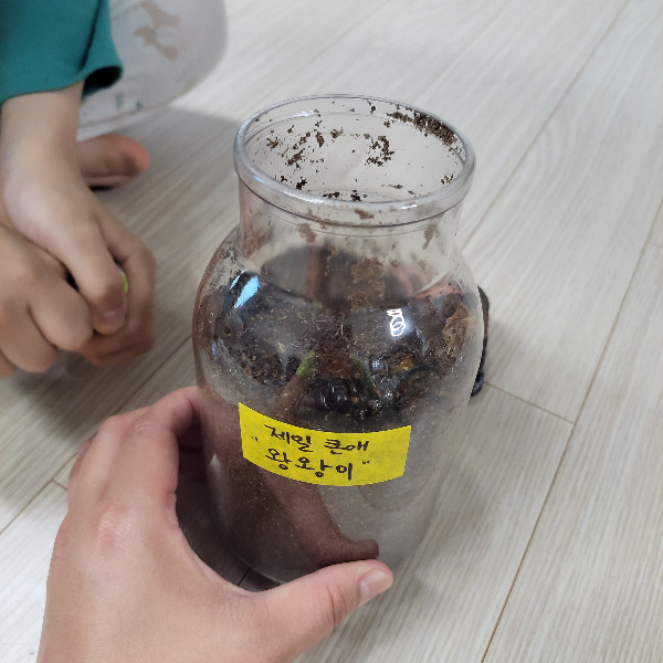 ♡남턱이♡는 가장 먼저 발견한 넓적사슴벌레 3세인데 아들의 소망을 듬뿍 담아 이름에도 수컷향기가 느껴집니다. 태어난 지 3개월이 되었는데 같이 발견된 세 마리 중 가장 크네요. 왼쪽 병의 이름 없는 녀석과 사이즈가 2배 차이 나네요. 크기가 2배 차이 나면 수컷 확정이라 점쳐 봅니다. 혹시 모르죠. 2세 때 5개월 후 태어난 막내가 가장 큰 수컷이었던 걸 생각해 보면 모를 일입니다.