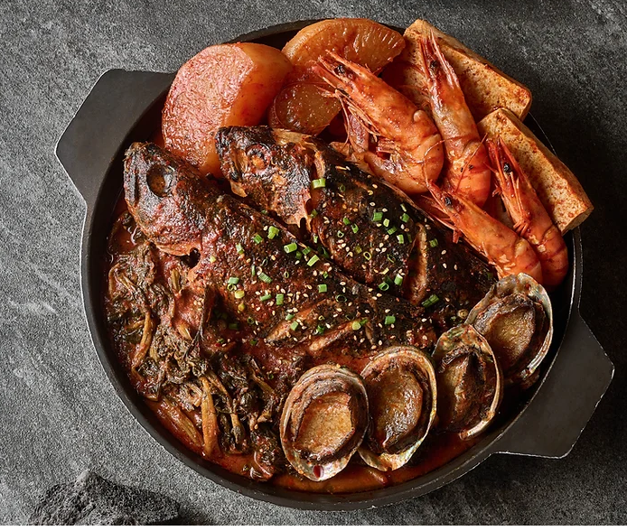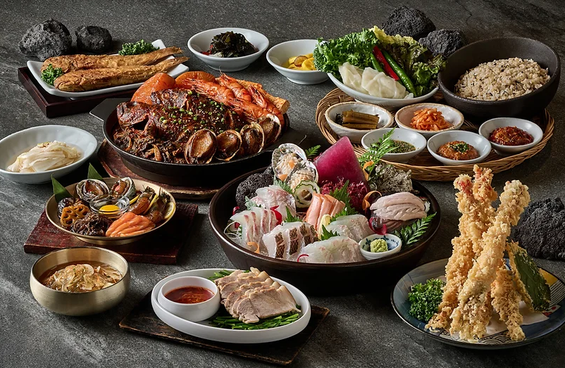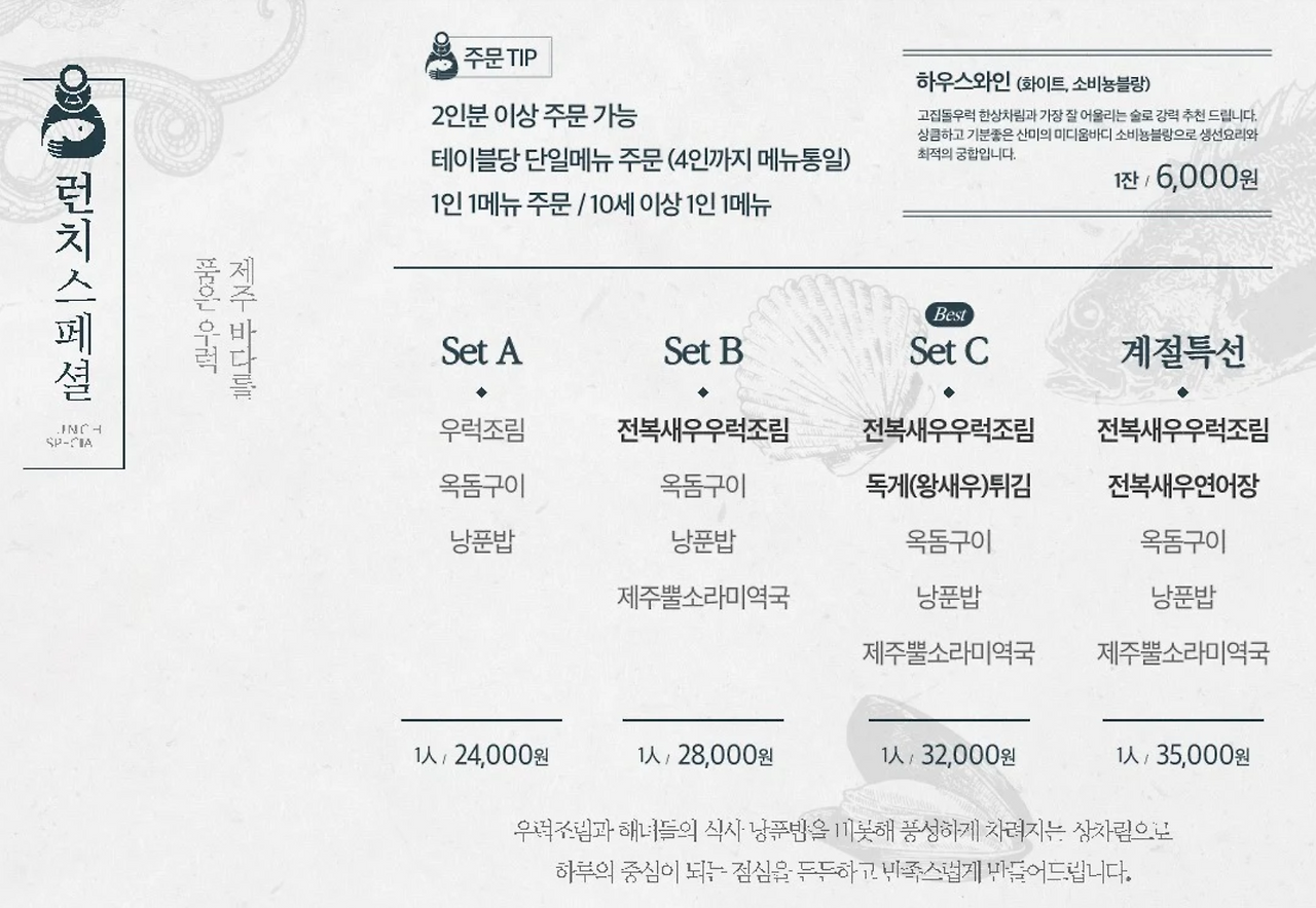 런치(set A~C), 디너(산, 해, 진, 미)로 메뉴가 구분된다. 런치 set B를 먹으면 전복새우우럭조림, 뿔소라미역국, 옥돔구이가 나온다. 왕새우튀김까지 먹고 싶다면 C를 시키면 된다. 디너에는 수육 등이 추가된다.