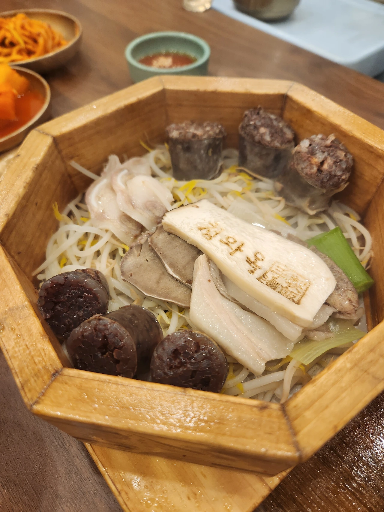 청와옥에 대해 알게 된 것은 <놀면 뭐 하니?>라는 프로그램이었다. 유재석 씨가 혼자 순대국밥을 먹는 장면이 나왔는데, 편백나무에 찐 모둠순대가 눈에 띄었다. 워낙 맛있게 먹는 사람이기도 하지만, 머리 고기와 숙주, 순대가 어우러진 구색에 반해 메모를 해두었다.