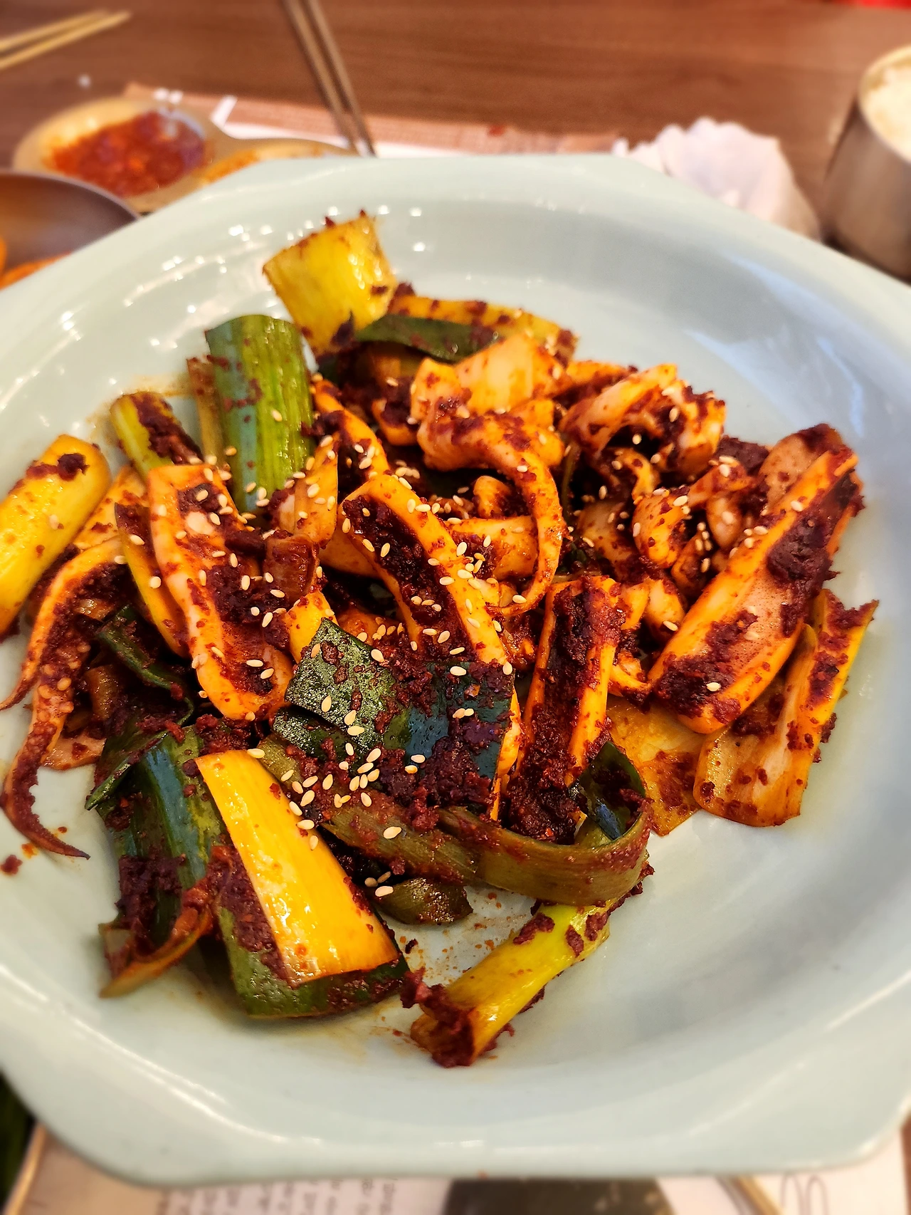 양이 많은 사람이라면 어린이국수를 추가로 주문하면 좋을 것 같다. 넉넉한 양, 맑은 국물, 그리고 무슨 비법일지 모를 탱글한 식감의 면이 포만감을 더해준다. 또 하나의 추천 메뉴는 불오징어. 9,900원 할인 중이다. 매콤한 불맛이 더해진 상업적인 맛. 입에 착착 감긴다.