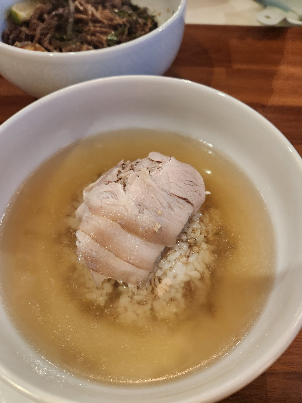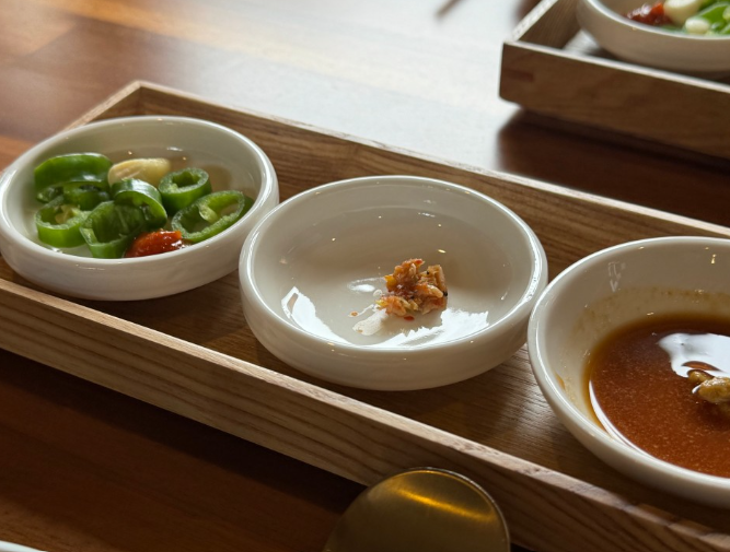함께 제공되는 (특제라고 말하는) 새우젓과 겨자간장 소스는 특별하진 않지만 나쁘지 않다. 셰프의 킥까지는 아니어도 훌륭한 온반의 보조 정도는 된다.