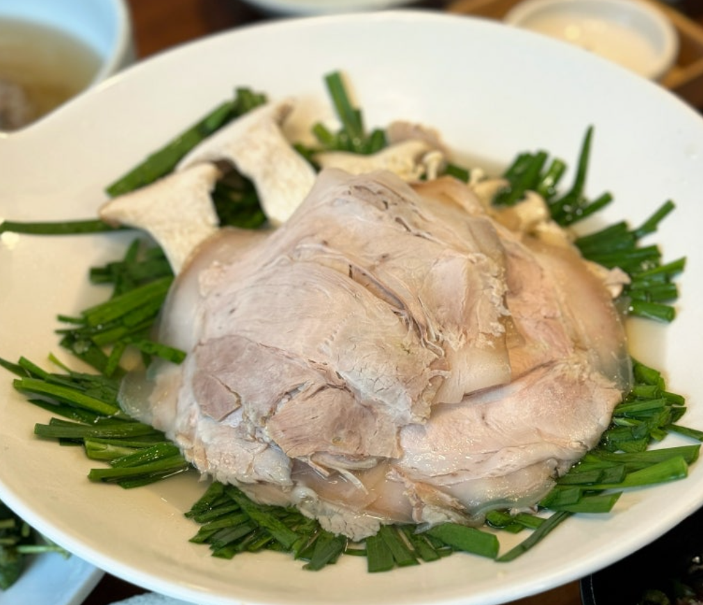 생부추 위로 얇고 넓게 저민 돼지고기를 얹어 맑은 육수에 자박하게 끓여내는 조합. 테이블 위에서 고체연료를 태워 따뜻하게 데워주는 수육은 술자리의 온기를 지켜준다.
