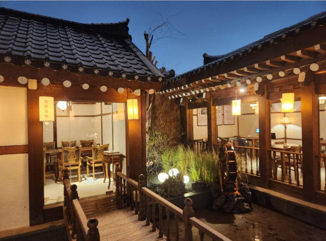 이렇게까지?라는 생각이 들 정도로 화려하고 화려하다. 뻥 뚫린 식당 한중간에 작은 연못이 있고 그 주변을 통유리로 둘러 테이블을 놓았다. 요정이 호황기였던 시기에 이곳이 얼마나 번쩍였을지 짐작이 가는 구조다. 내부 인테리어는 근현대를 닮았다. 주광빛 조명을 비추는 엔틱 한 모양의 등과 단순하지만 고급스러운 느낌의 식탁이 있다. 하지만 그 전체를 아우르고 있는 한옥 구조가 인사동에서 곰탕을 팔고 있는 이곳의 정체성을 지켜준다.