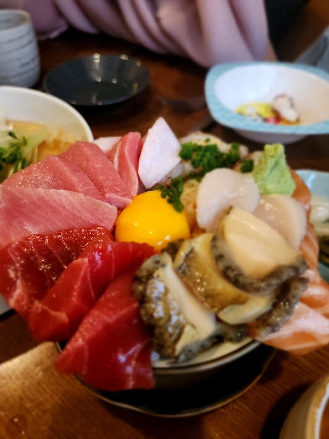 먼저, 카이센동. 맛은 있지만 가격이 비싸다는 후기들이 있는데, 동의하기 어렵다. 참치뱃살과 가리비, 전복, 연어 등등의 재료를 생각했을 때 비싸다고 할 수 없다. 특히나 무르지도 질기지도 않게 적절히 숙성시킨 선어와 전복내장으로 만들어낸 풍미 깊은 소스, 두툼하고 푸짐하게 담아낸 사시미를 생각하면 부담스럽지만 아깝지 않은 가격이다.