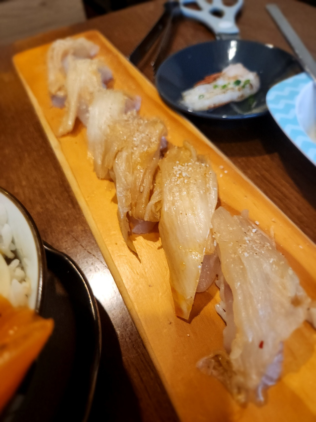 특이하게 초밥이 따뜻하다. 정통쉐프들은 맛을 위해서 얼음물에 손을 담그며 초밥을 쥔다고 한다. 그만큼 차가운 온도가 중요한 음식인데 밥이 따끈하다. 그런데 이게 싫지 않다. 이질감이 들거나 거북스럽지 않고 따스한 한 술을 뜨는 기분이다. 초향이 강하지 않은 샤리와 적절히 숙성된 네타, 거기에 잘 씻어낸 묵은지의 조합. 6피스가 모자라다.