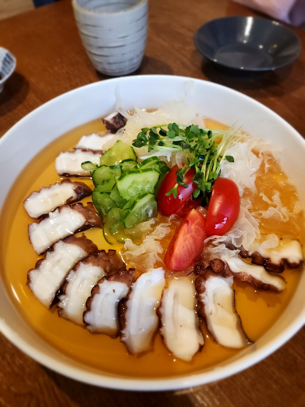 아내의 원픽은 문어 샐러드였다. 무슨 소스로 만들었는지 자꾸 손이 가게 새콤하고 싫지 않게 달콤하다. 부드럽게 삶아진 문어숙회에 목이버섯, 아삭한 오이를 곁들여 먹는 맛이 일품이다. 냉채소스와 닮았지만 덜 자극적이고 더 당긴다.