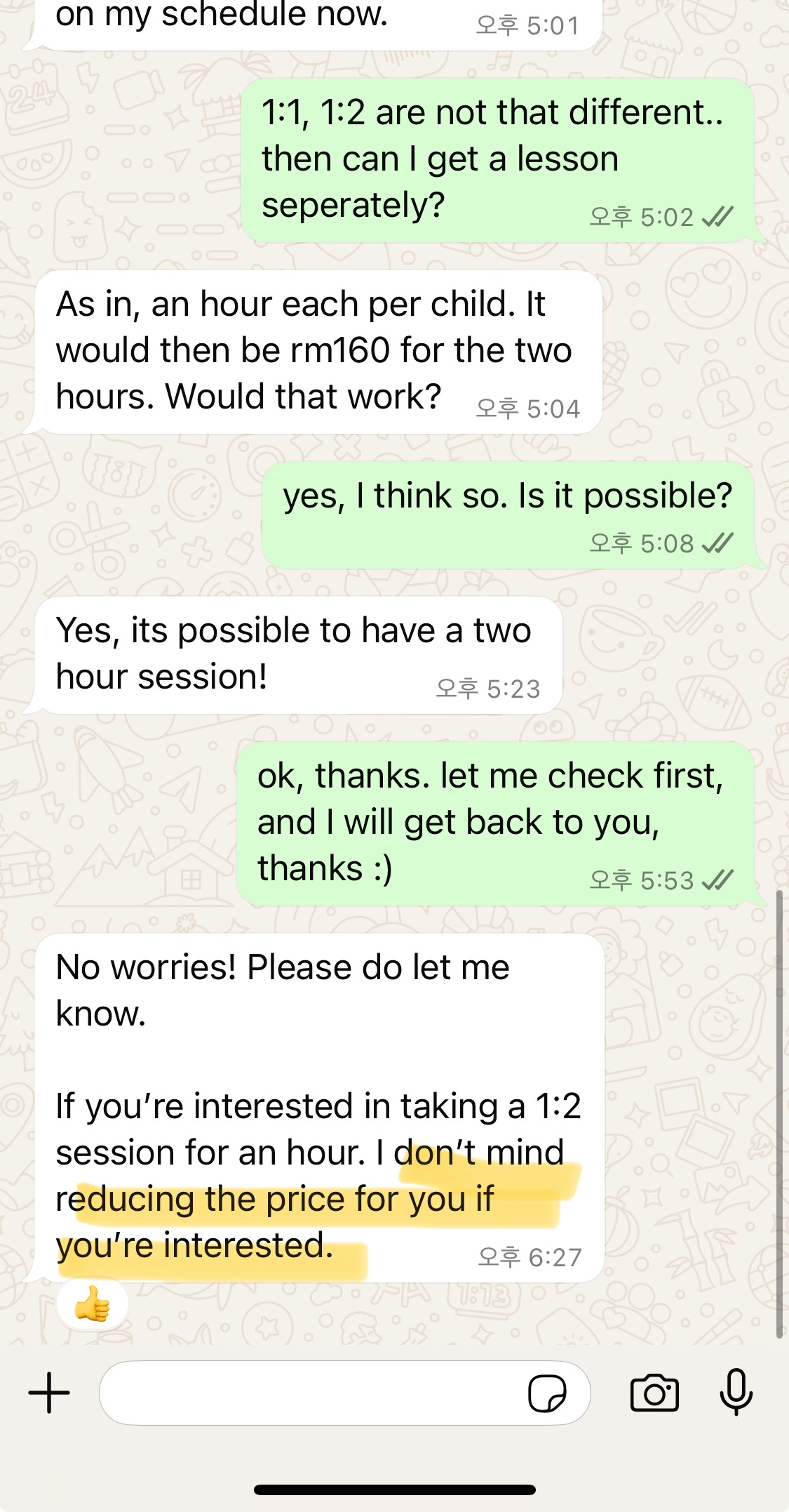 솔직히 나는 이런 시스템이 별로 마음에 들지 않아서 흥정하기보다는 다른 강사에게 연락을 하는 편이다.