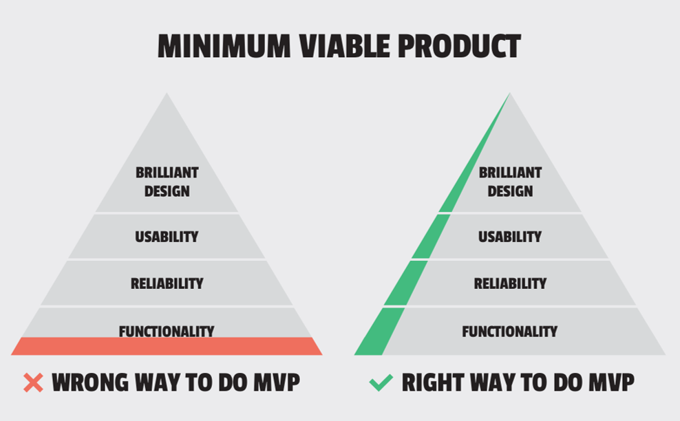 사업 시작부터 사업가가 천하장사가 될 수는 없겠지만, 사업가는 항상 천하장사를 꿈꾸며 진행해야 한다. 그 와중에 조용하게 집중하고, 생각해보자. 자신의 아이템이 정말 시장이 있는 것인지, 접근이 가능한지 말이다. 시장을 검증하기 위해서 최소한의 기능을 가진 제품을 출시하게 되는데, 전문 용어로 MVP(Minimum Viable Product)라고 한다. MVP를 만들어내기 위해서는 아래 그림과 같은 접근이 중요하다고 한다. 기능을 기초적으로 만드는 것이 아니라 기능을 전부를 어떻게든 되게 만들어서 경험을 제공하는 것이다. 이는 MVP의 목적이 시장검증에 있기 때문이다. 기능만 제공하는 수준에서 시장을 검증하기란 적절하지 않다. 이 제품이 어떻게 좋은지 경험시켜주는 것이 중요하다.