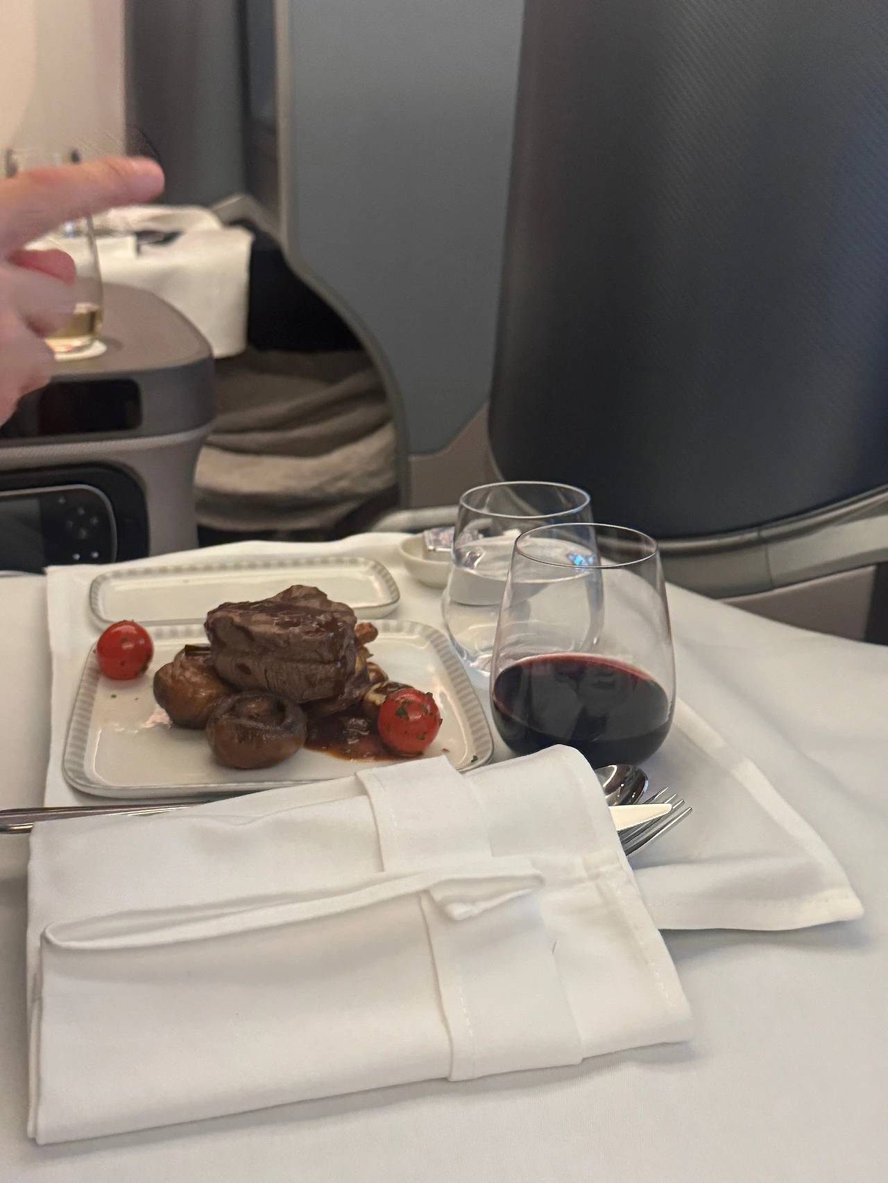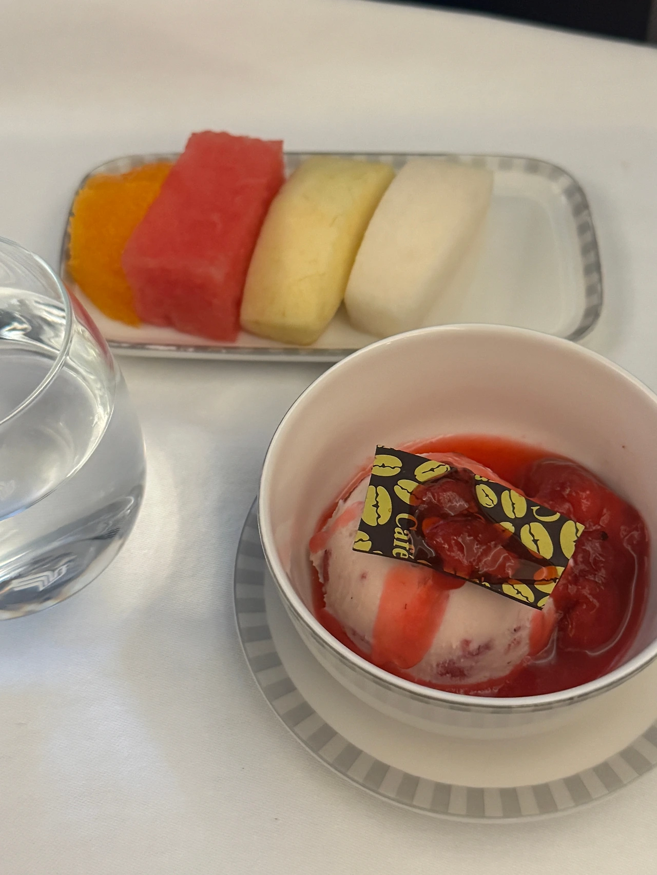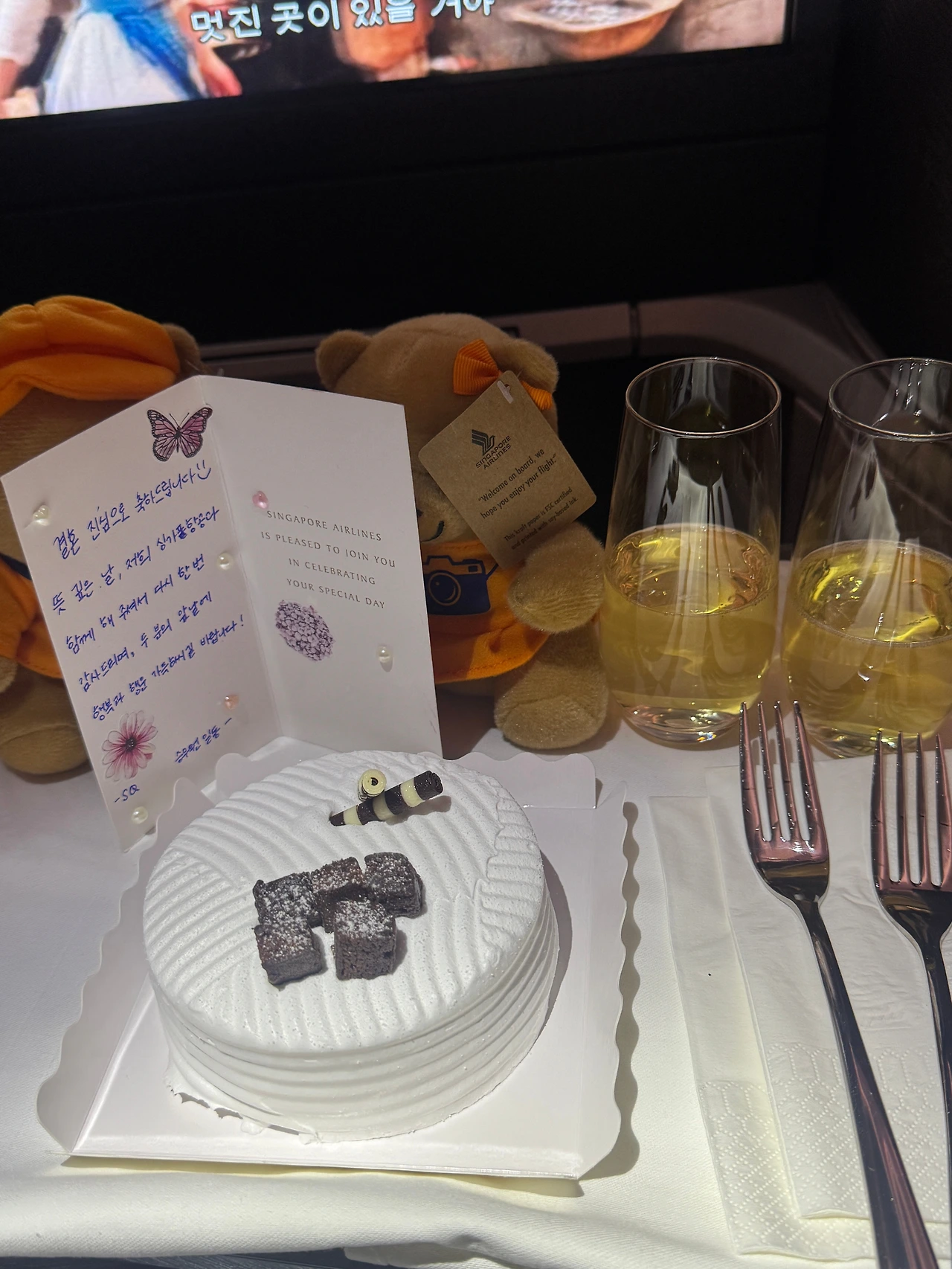 비즈니스 석에만 제공되는 폭신한 양말을 신고 널찍한 좌석에 다리를 쭉 펴고 앉았다. 웰컴 샴페인을 신랑과 함께 건배했다. 에피타이저로 나오는 싱가포르 수미사테를 맛본 순간, 두 눈이 동그래졌다. 파리에서 먹은 것만큼이나 부드럽고 맛있었던 따듯하게 데워진 패스츄리는 빵순이를 흥분케 했다. 디저트로 나온 무척이나 빨갛고 달고 시원한 수박 두 조각은 정말 예쁘게도 잘라져 있었다.