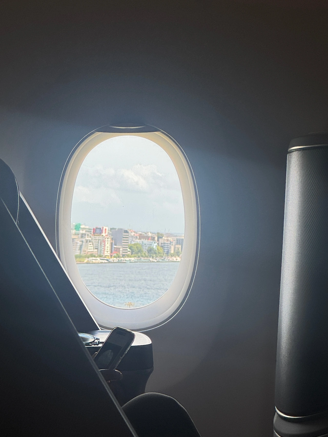 몰디브로 가는 비행기에는 더 다양한 인종의 사람들이 많았다. 그중 비즈니스 석에 탄 신혼부부는 우리뿐이었는데, 특히나 여자아이들의 사랑스러운 시선이 느꺄졌다. 분명 긴 여정이지만 비즈니스 석이라 하늘 위에서 즐기는 기쁜 여행이었다. 이제 진짜 몰디브로 떠난다!