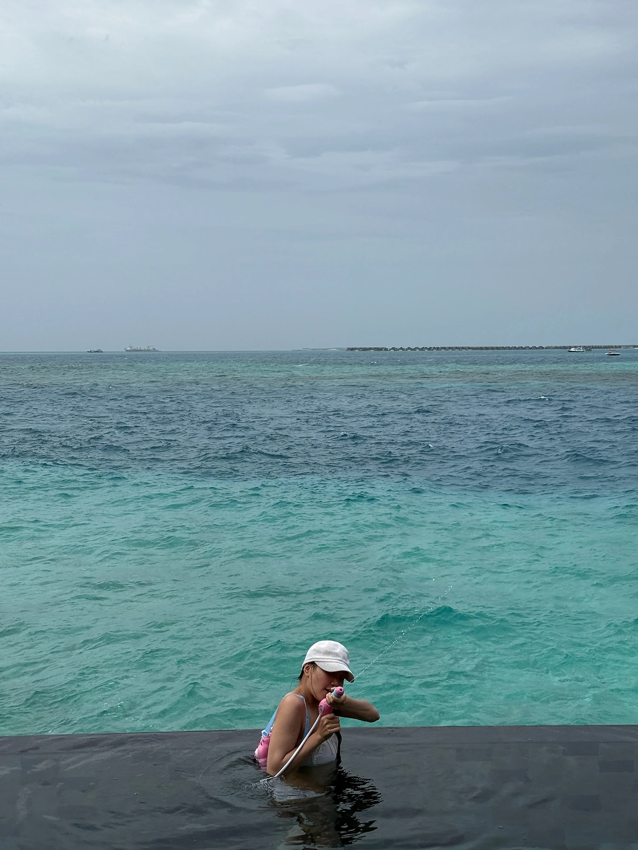 워터빌라는 바다 위의 숙소라 사다리를 타고 내려가면 곧장 발이 닿지 않는 깊이의 푸른 바다와 만나게 된다. 첫째, 둘째 날과는 다르게 아침에 세차게 비가 왔던 셋째 날 몰디브의 오전이었다. 조식을 잔뜩 먹고 침대와 소파 위를 뒹굴거리다 이내 심심해져 바다에 뛰어들었다. 신랑의 손에 고프로를 쥐어주고 입수! 요시고 사진 같은 장면을 원했다.