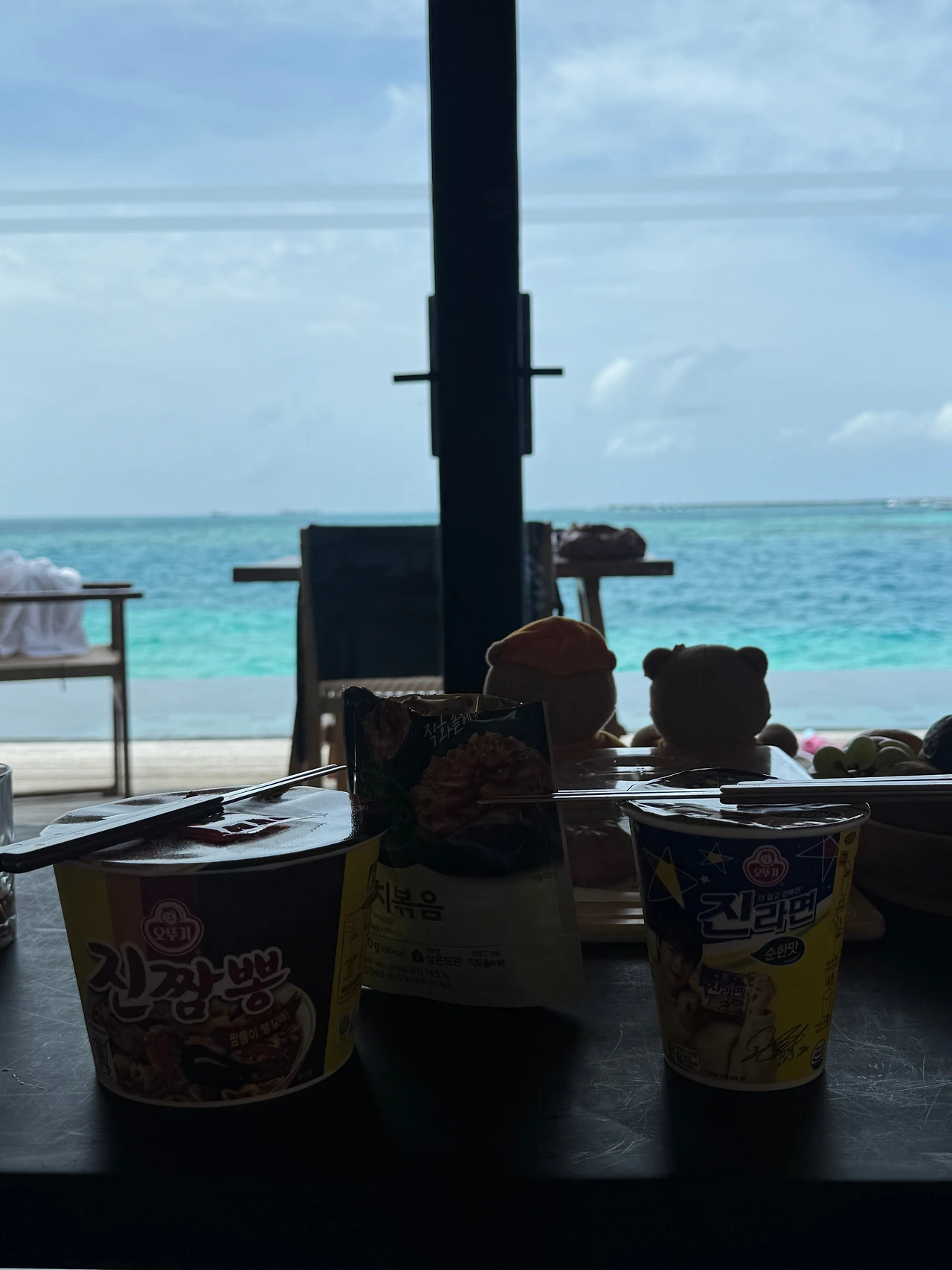 상어를 잔뜩 보고 와서 넷플릭스에서 상어에 관한 영화와 서바이벌 게임 프로그램에 빠지게 되었다. “All the sharks”라는 상어 찾기 대결 프로그램과 “센 강 아래”라는 돌연변이 상어가 파리에 나타나는 공포 영화는 물놀이를 마친 뒤 시원한 워터빌라의 킹 침대에 누워 보기에 완벽했다. 힐튼 아밍기리 리조트는 올 인클루시브이지만, 아침+저녁을 제공하는 하프보드로 점심은 따로 사 먹거나 가져온 음식을 먹을 수 있다. 늦은 오후에 출출해지면 한국에서 가져온 컵라면과 과자를 먹곤 했다. 야심 차게 가져온 떡볶이는 전자레인지가 없어서 먹지 못하고 가져왔고, 컵라면과 김치, 과자는 많으면 많을수록 좋았을 것이다. ‘뭐 좀 거기서 사 먹지‘라고 생각했는데, 가격표에는 $4 인 제로콜라가 tax, service fee가 붙어 15,000원이 된다. 우리는 술을 즐기지 않아 음료를 포함하는 옵션은 제외했다. 대신 오후 3시쯤 바에 나가 코코넛 워터를 사 먹거나 논알코올 칵테일을 마셨다. 식사 중에 가끔 와인을 먹는 날도 있었지만, $20 이하라 크게 부담되진 않았다. 다만, 알코올이 아닌 논알코올 음료 무제한 옵션을 추가했다면 맘 편히 마셨을 것인데 아쉬웠다. 술을 즐기는 커플이라면 더없이 좋을 천국이겠다.