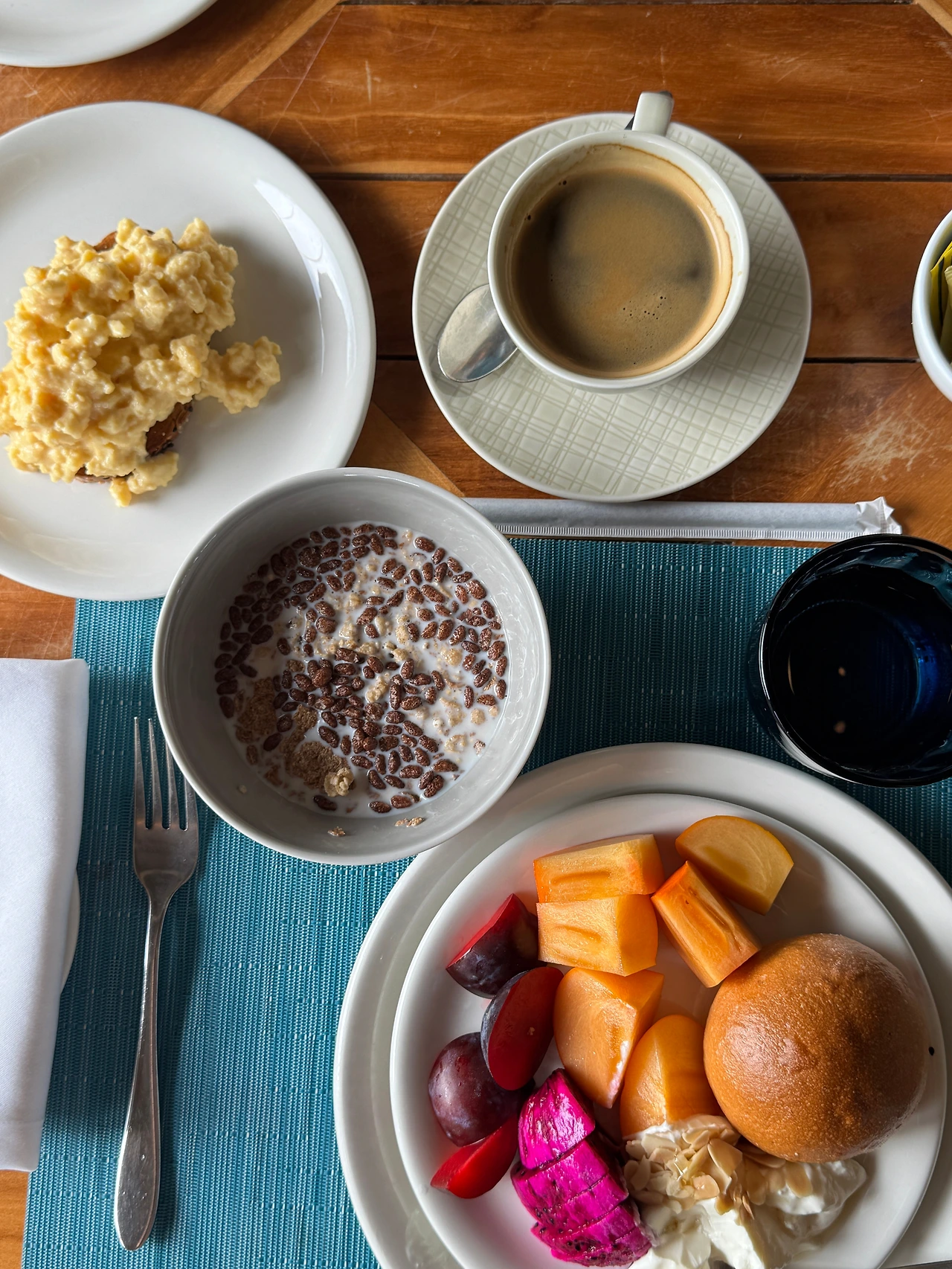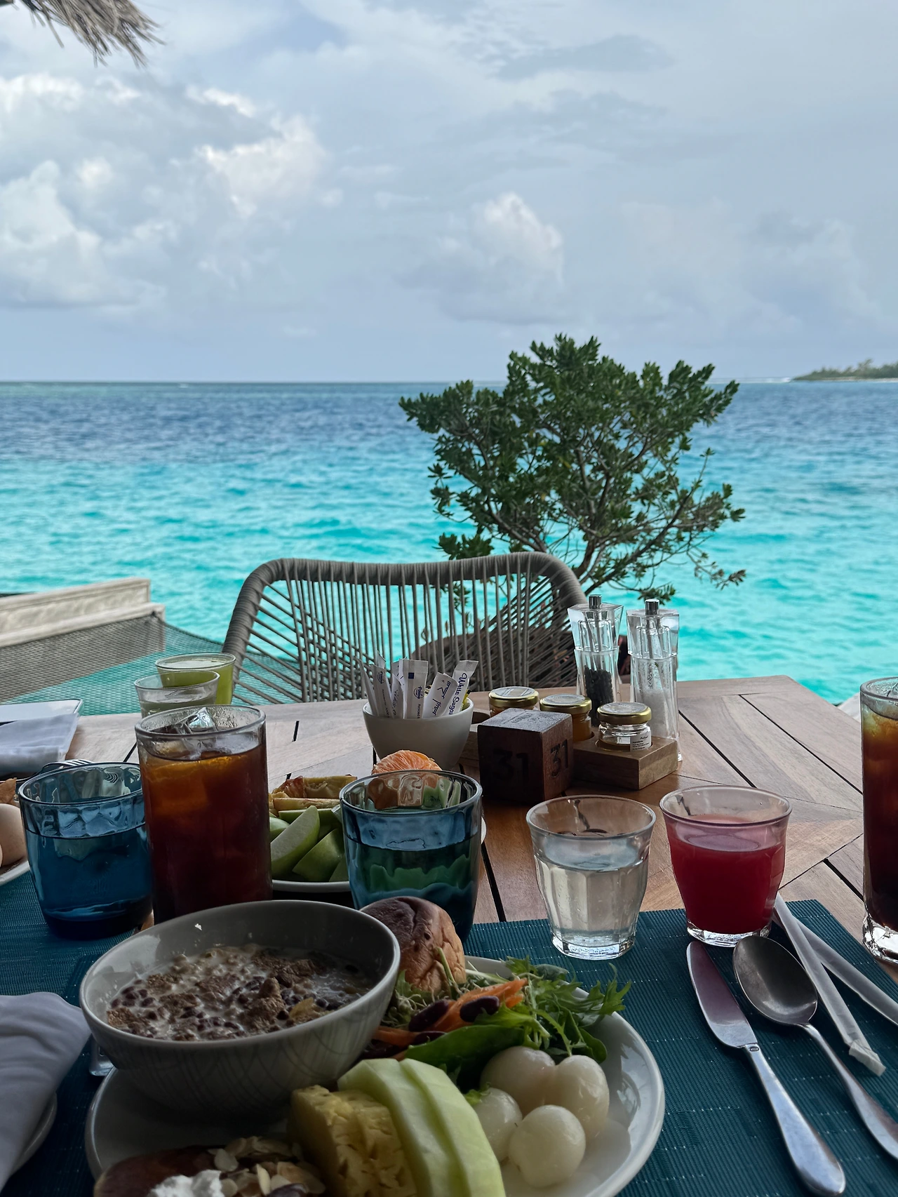아무 걱정 없이 매일 마음껏 먹고 쉴 수 있는 신혼여행이었다. 회사 일과 결혼 준비로 한껏 날카로웠던 뾰족한 마음이 평지에서도 자유로이 구를 수 있을 만큼 둥글어졌다. 청록의 바다와 함께하는 조식 뷔페는 6일 내내 질리지 않았다. 좋아하는 스크램블 에그와 딸기잼을 바른 모닝빵, 쓴 블랙커피. 시나몬 가루를 뿌린 뮤즐리, 한껏 눅눅해진 시리얼은 나의 페이보릿.