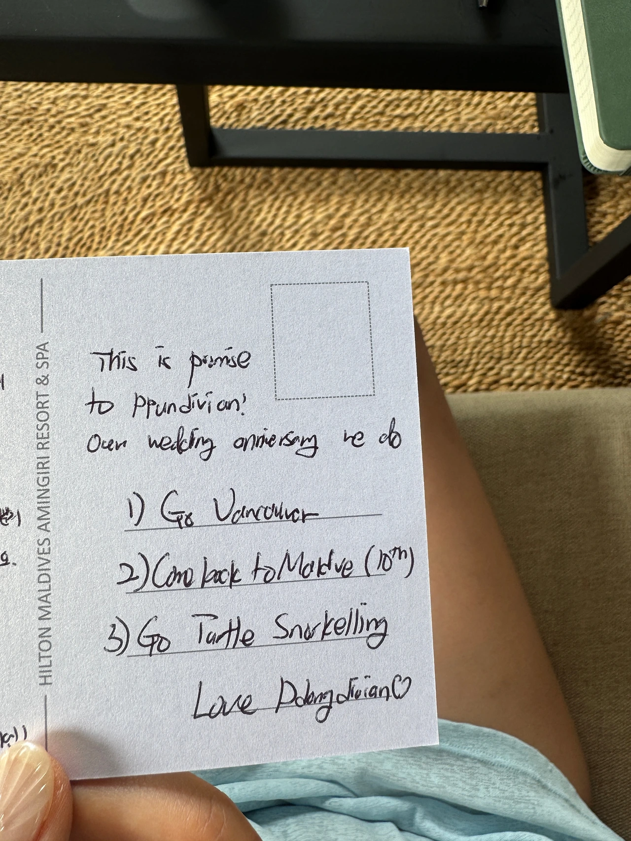 평생토록 기억에 남을 달콤한 허니문. 우리 이제 한 팀이 되어 만들어나갈 인생의 파노라마에서 가장 행복한 순간의 조각. 소중하게 간직하고 또 간직한다. 결혼 10주년에 꼭 몰디브에 다시 오자고. 그때 우리는 행운의 거북이를 볼 거야 약속했다.