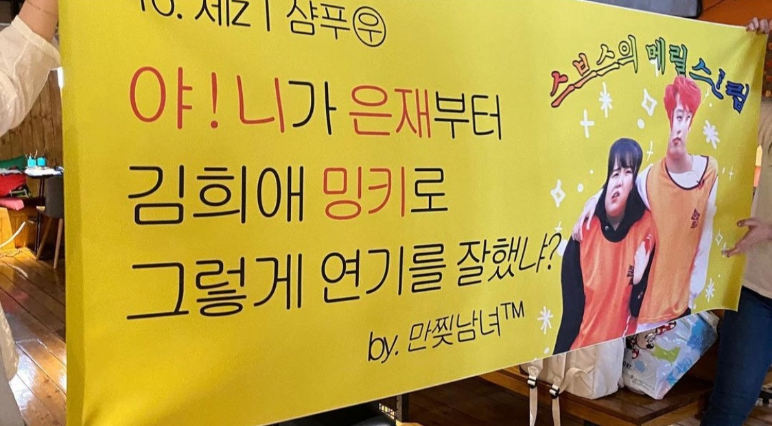 이 과정에서 재재와 야니는 새벽 6시 첫 촬영씬부터 시작해야 하는 극단적인 하루를 시작하기도 했고. 하마터면 인터뷰는 포기해야 할 뻔 했던.. 우여곡절이 있었지만.. 그럼에도 불구하고 끝까지 의리로 함께해준 문특팀. 그 덕분에 만화책 속에서 튀어나온 남자 주인공으로부터 벌어지는 좌충우돌 [만찢남녀]의 로맨스가 더욱 힘을 받게 됐고. 이렇게 매번 의리와 애정으로 함께해주는 문특팀에게 우리는 마지막(?) 선물로 레드카펫과 상패..는 아니고..ㅎㅎ 현수막을 준비했다.