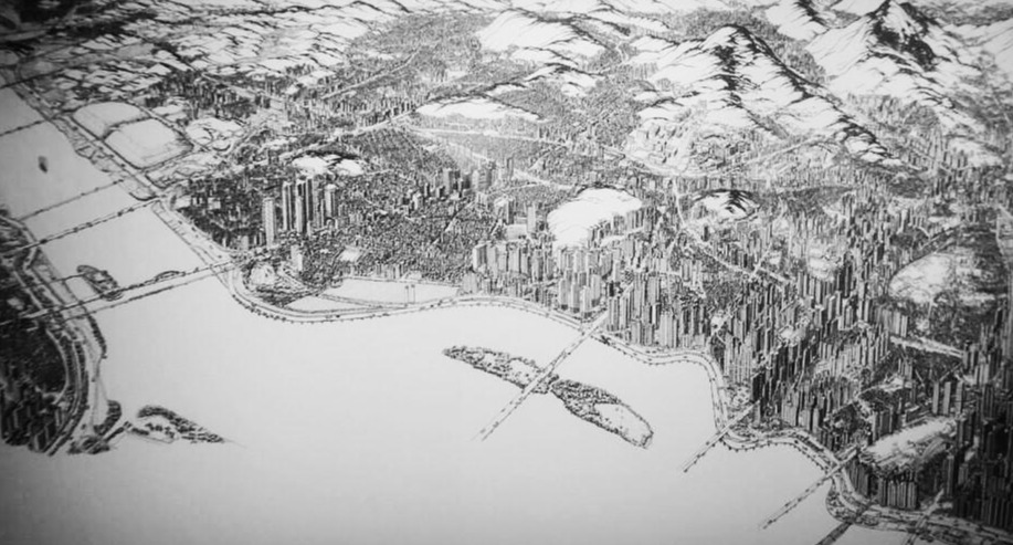 빌딩의 뾰족함과 함께 바위산의 굴곡으로 그 대비를 여실히 나타냈다.