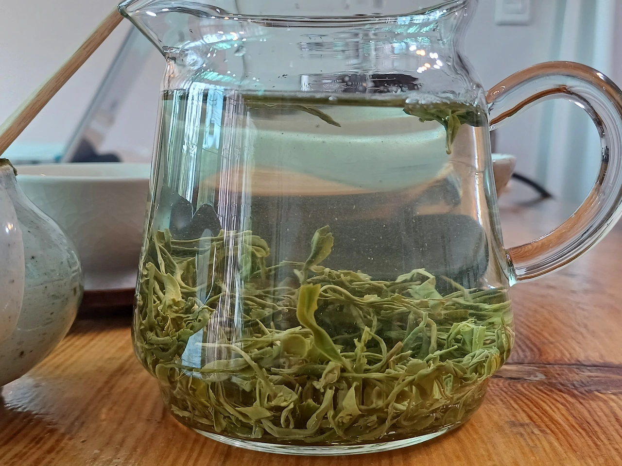 아주 작은 잎들과 약간의 차나무줄기가 섞여있는 봄내음 가득한 녹차이다. 잎을 익히지 않으려고 살짝 식혀 빠르게 우렸더니 물맛이 났다. 우린 찻물을 다시 넣어 우렸더니 간이 딱 맞았다.