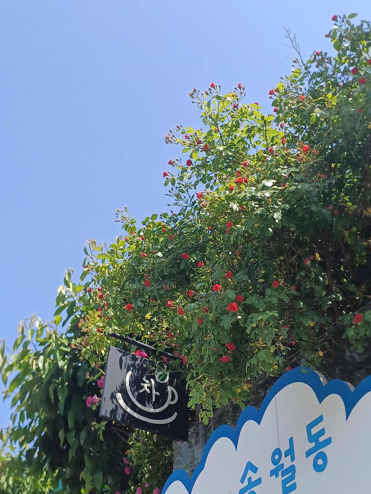 - "세로로 찍어봐"라는 말을 들었다. 그 말이 궁금해서 다실아래 벽화를 쳐다보니 장미와 스칼렛장미가 골고루 피어있는 모습이 벽화와 나름 어울렸다. 식사 후 동화마을 산책할 땐 세로사진도 찍어보세요 :)