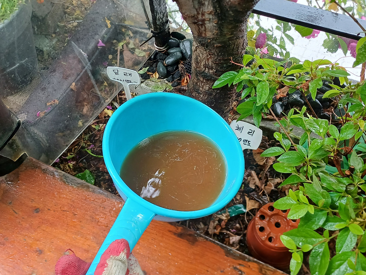- 빗물과 무향고체퇴비를 섞어서 화단에 물을 줬다. 며칠 뒤 다시 보니 잎들의 녹빛이 조금 진해진 것 같다. 고체퇴비가 땅에 스며드는 시간을 기다리기 답답해 물에 풀었는데 생각지도 못하게 잎들이 선명해졌다. 식물도 알약보다는 물약이 먹기 편한 듯하다.