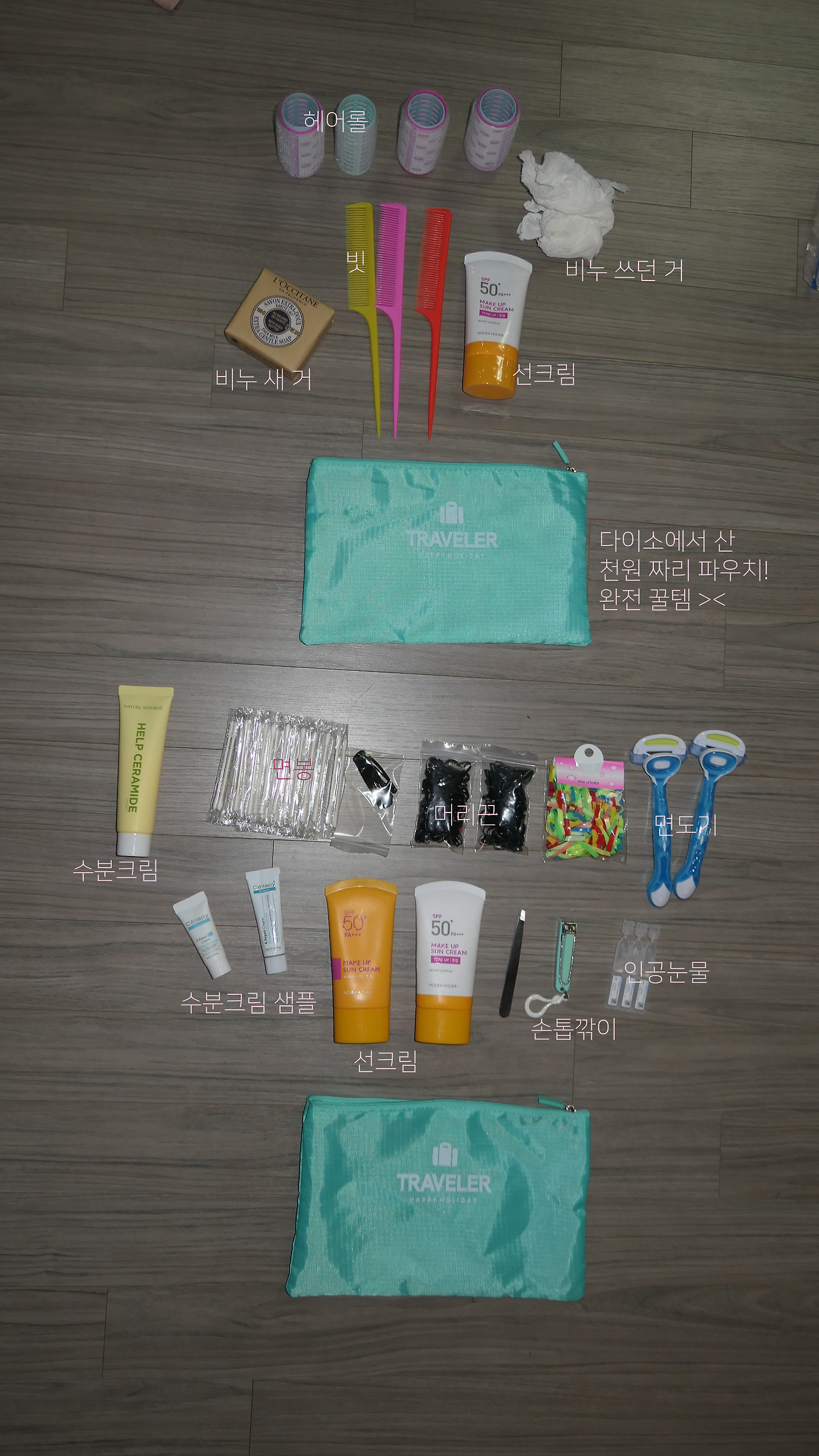 멀티콘센트, 다이어리 여분, 치약, 폼클렌저, 복대, 헤어밴드, 모기퇴치제, 화장품파우치, 양말, 구연산파우더, 판초(우의)