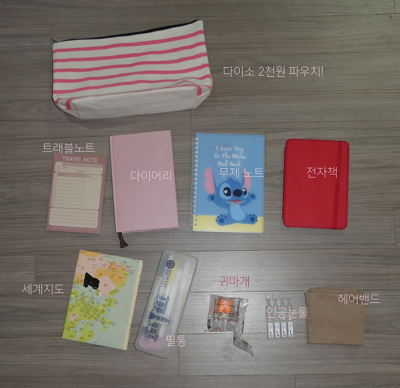 파우치3: 트래블노트, 다이어리, 무제 노트, 전자책, 세계지도, 필통, 귀마개, 인공눈물, 헤어밴드