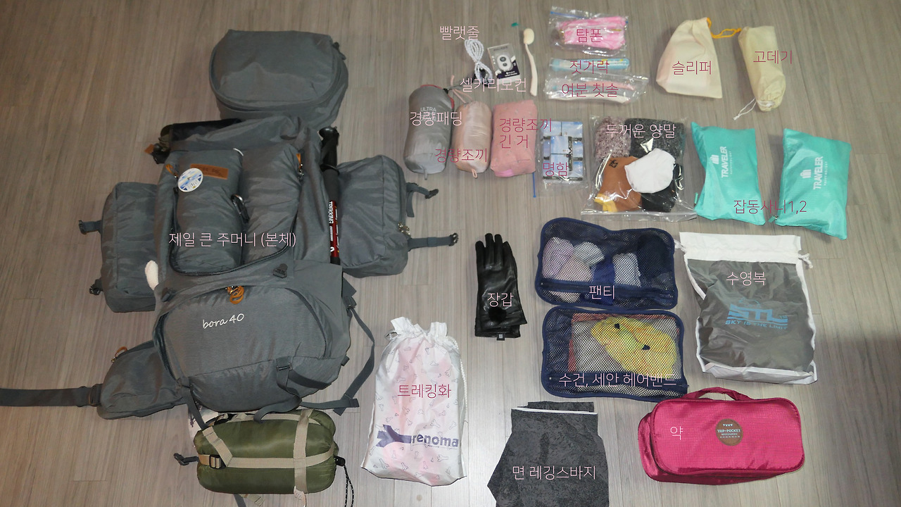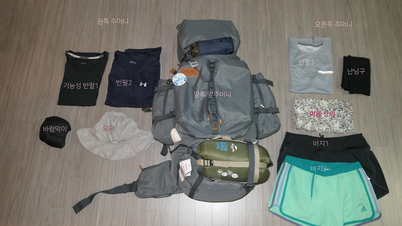 이외에는 배낭 레인커버, 버클 여분(가방 버클 고장나면 망하기 때문), 다수의 카라비너, 김지우 님께 협찬 받은 우산 등이 있다.