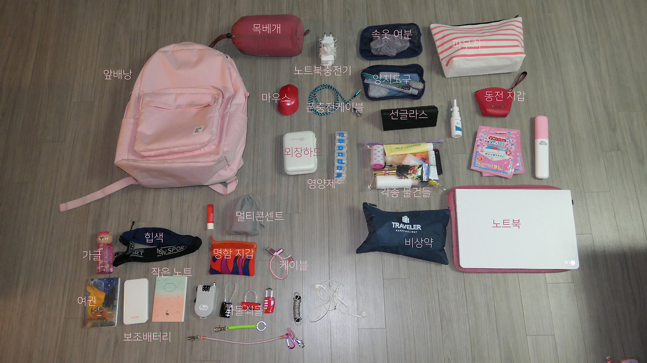 목베개, 노트북 충전기, 속옷 여분, 파우치, 마우스, 폰 충전 케이블, 양치도구, 선글라스, 동전 지갑, 외장하드, 영양제, 각종 물건들, 비상약, 노트북, 가글, 힙색, 멀티콘센트, 명함지갑, 케이블, 여권, 보조배터리, 작은 노트, 자물쇠들