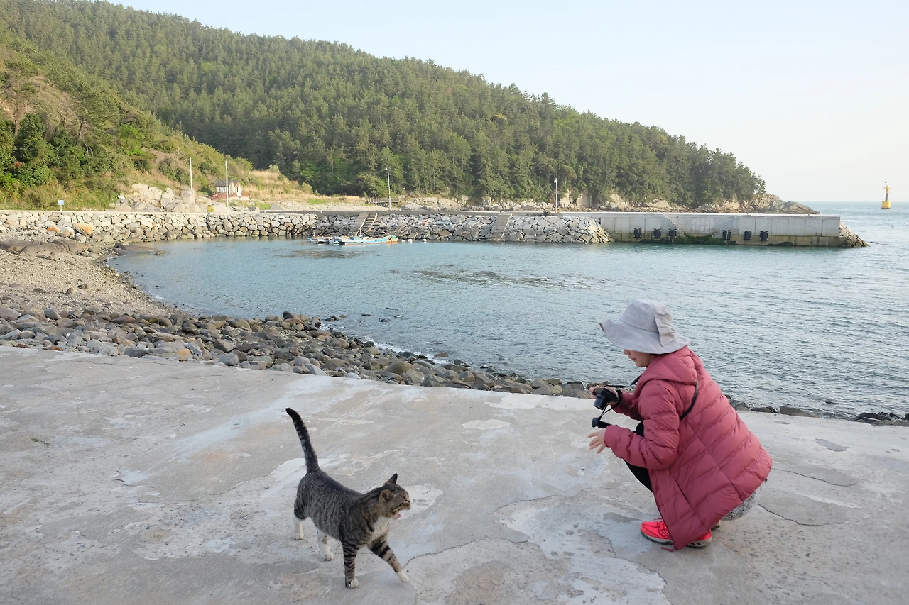 차 근처에서 고양이 한 마리가 걸어나왔다. 가까이 다가갔더니 고양이가 오히려 더 우리에게 성큼성큼 다가와서는 내 다리에 몸을 비빈다. 그리고는 남편 다리로 가서 또 비빈다. 사람에 대한 경계심이 전혀 없었다. 쓰다듬어주니 배를 보이며 드러눕는다. 이 녀석의 애교에 정신을 못차린 우리들은 오늘의 마지막 배 시간이 다가오고 있는 줄도 모르고 한참을 이 녀석과 놀았다.