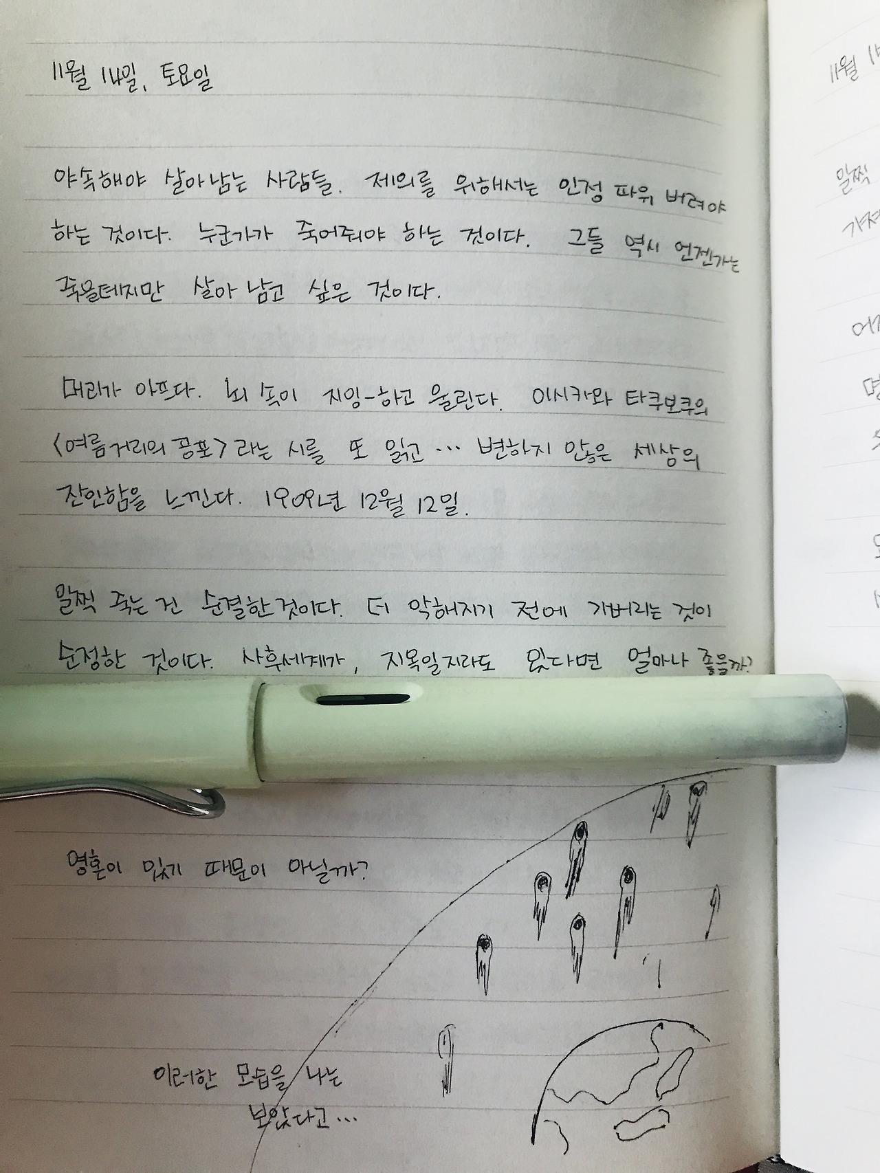 <천국으로 향하는 문> 34번. 2주 걸려 겨우 7행을 썼다. 악마와 싸우던 10월을 지나 이제는 유물론과 싸우고 있다. 야훼 신과 그리스도는 매칭이 여전히 잘 안된다.